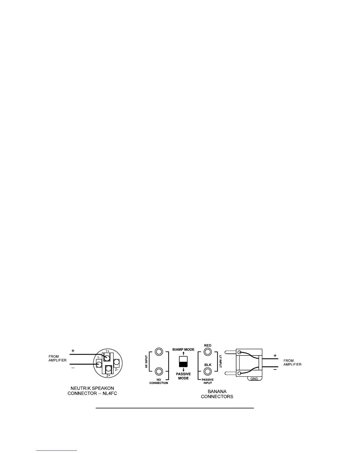 banana jacks or to either of the Neutrik Speakon connectors. Observe proper polarity when making