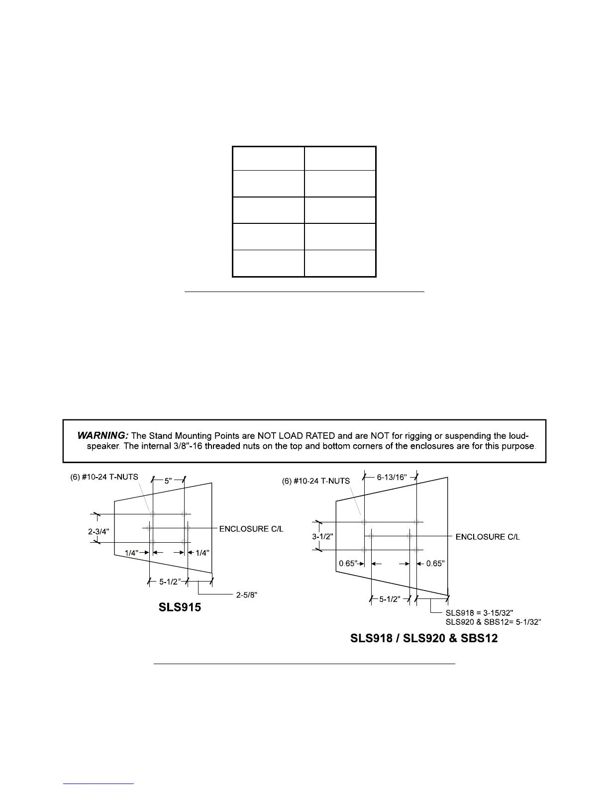 The SLS915, SLS918 and SLS920 loudspeakers and the SBS12 subwoofer have 5/16-18 threaded T-nut