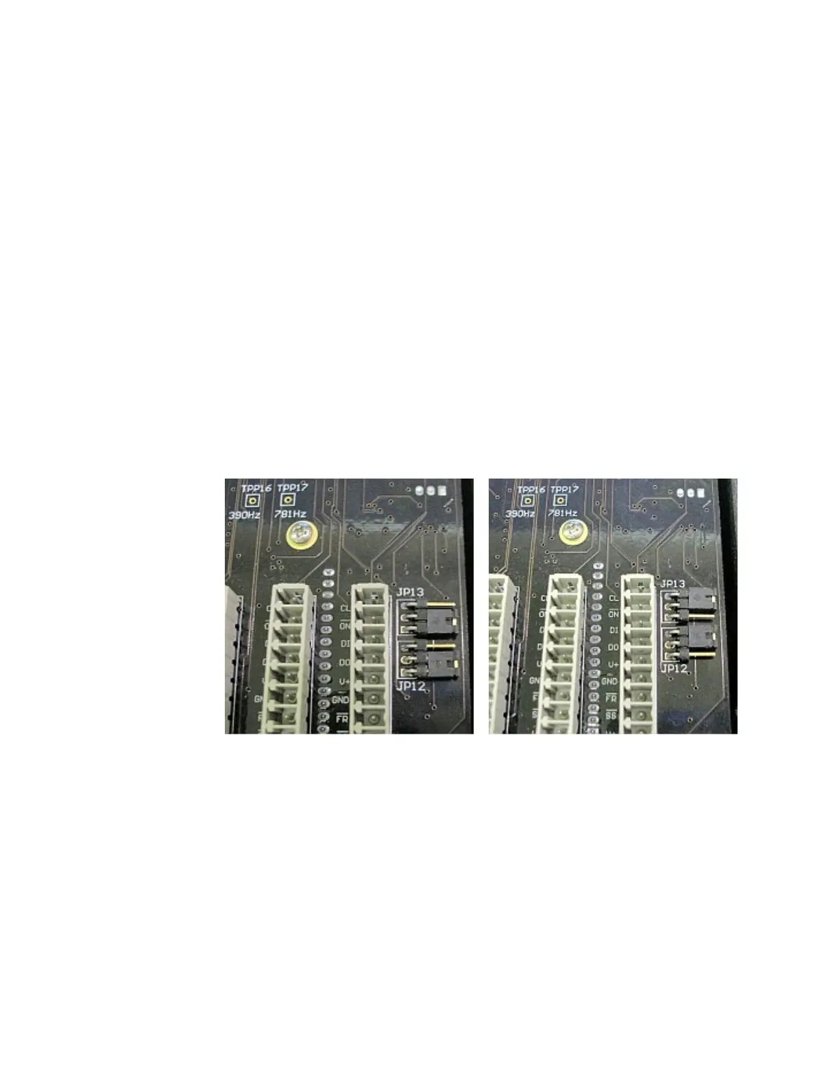 Figure 127 – JP12 & JP13 in Factory Default Position (left) and After Moving Shunts (right)