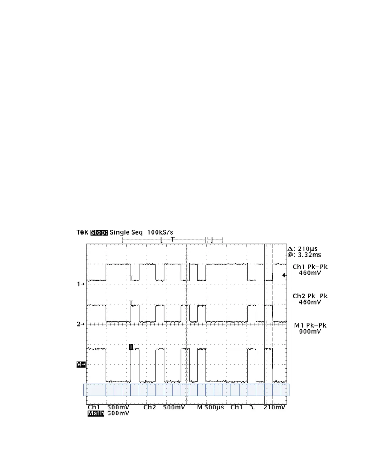 Channel 2 is the `B´ signal, and the Math trace is the differential voltage between `A´ and `B´;
