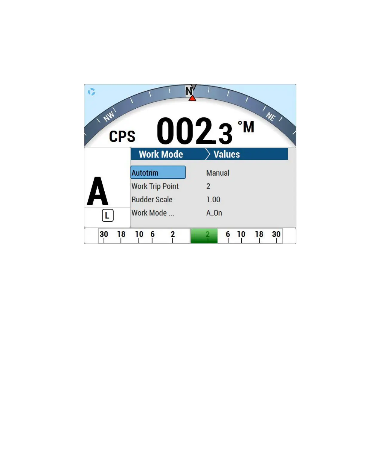 This menu line only appears when WORK mode is active. It shows the current rudder