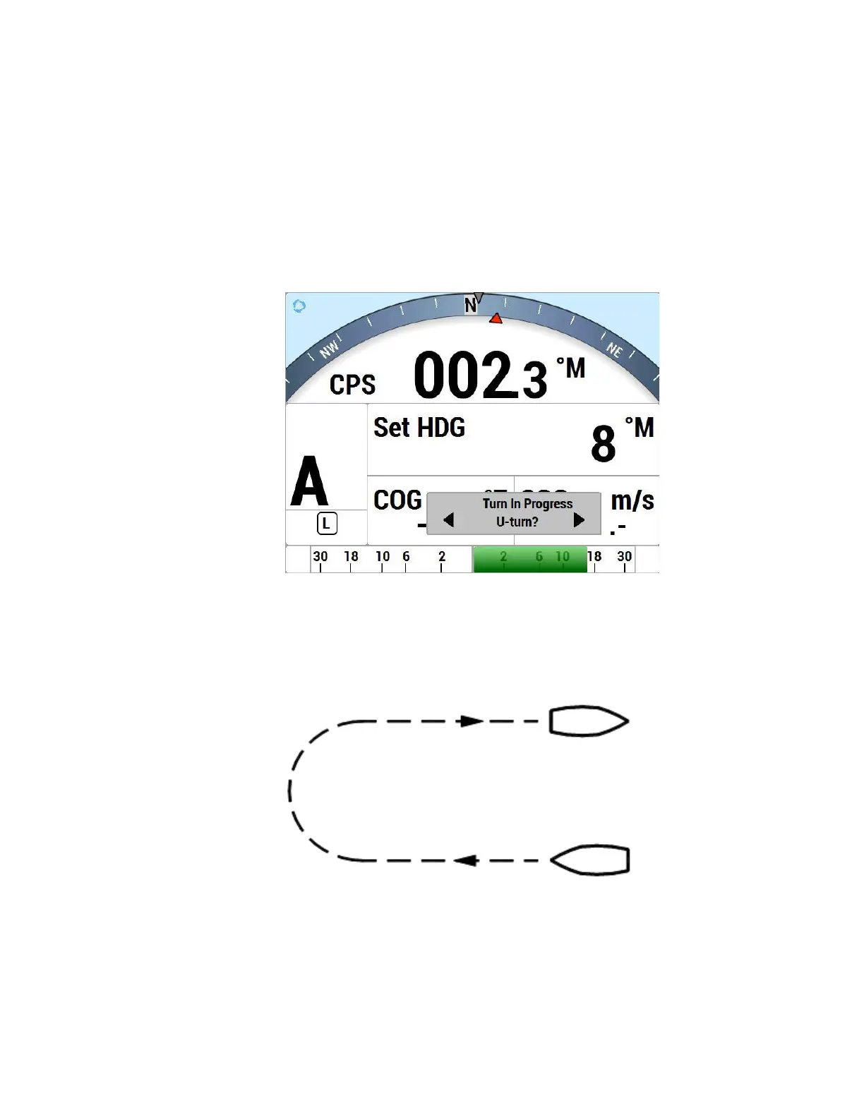 For a U-Turn, the autopilot calculates a reciprocal course to the vessel’s heading, and then