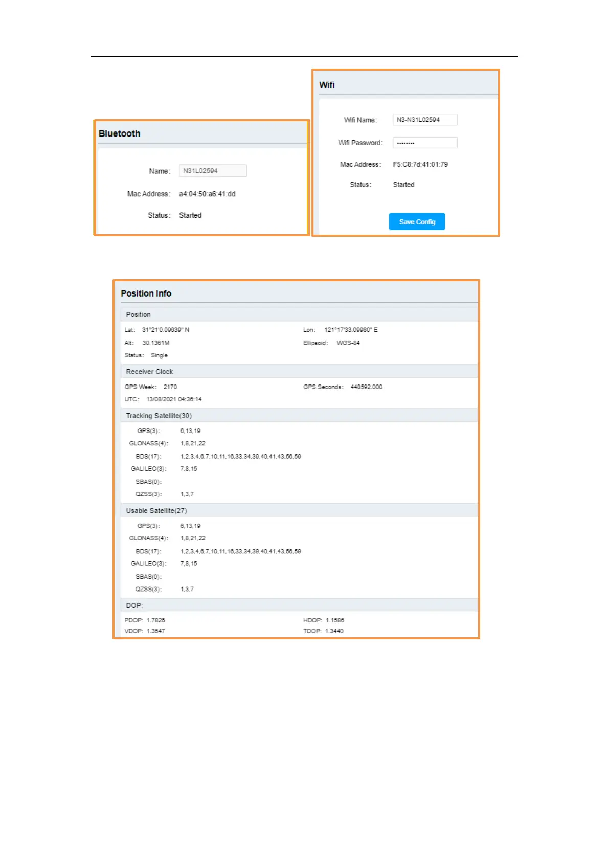 (5) Position info, shows position status, clock status, tracking satellites, used