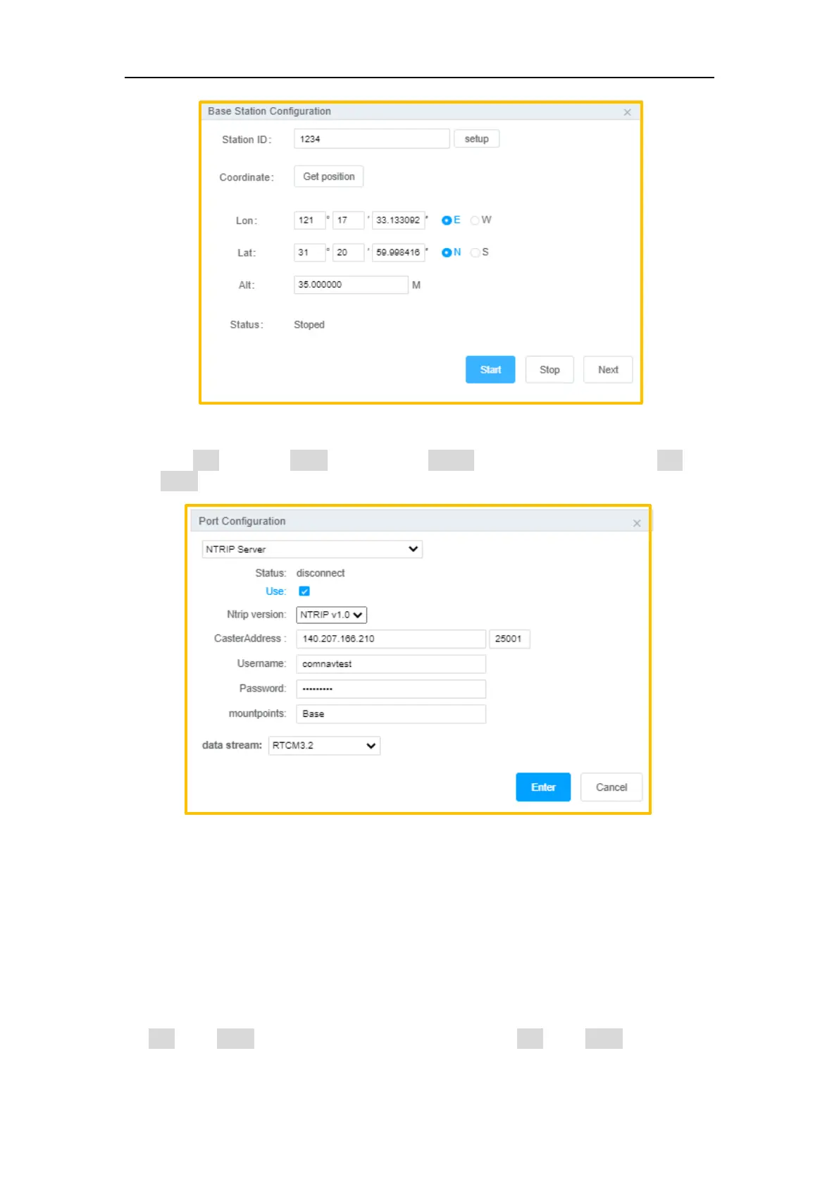 b) Ntrip settings: Choose Ntrip version, set IP, port, username, password, mountpoint,