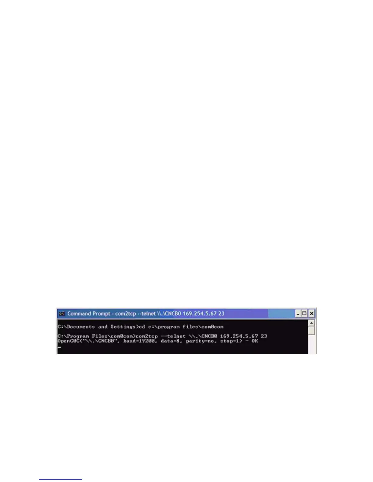 » At the command prompt, enter com2tcp --telnet \\.\<CNCB0> <IP address> <telnet port>