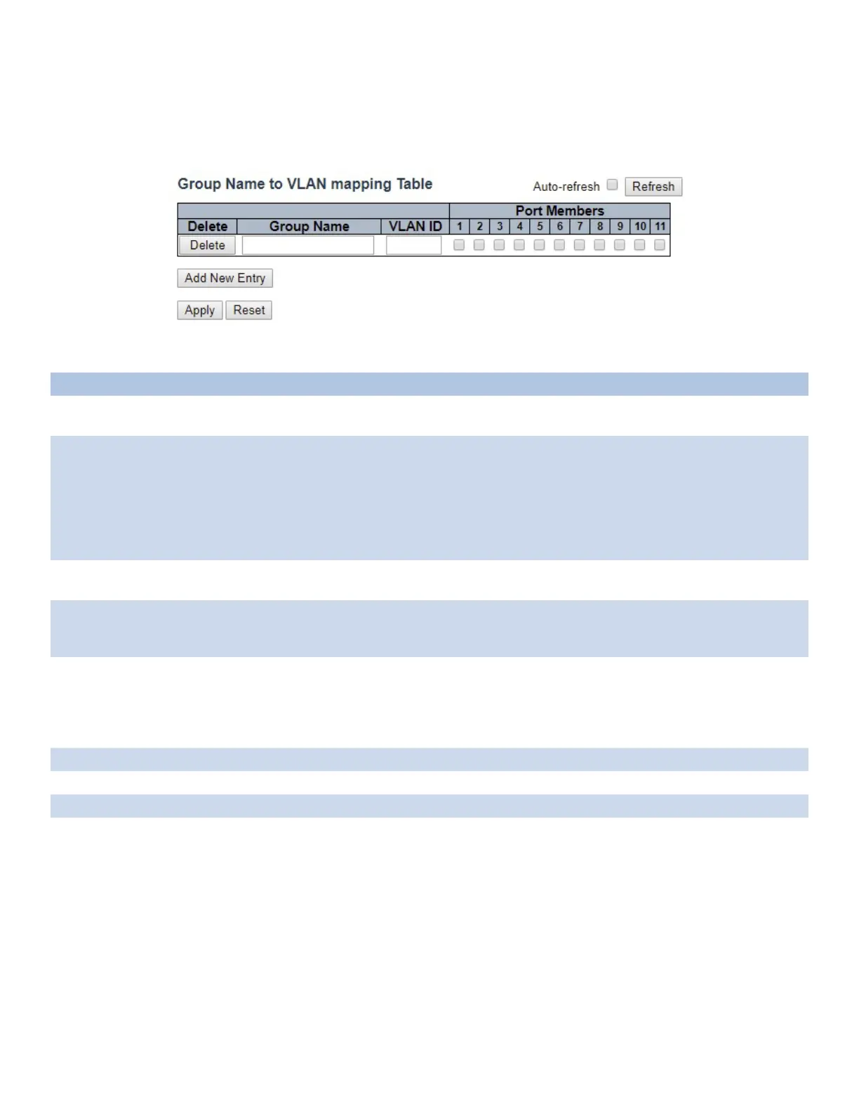Port Members A row of check boxes for each port is displayed for each Group Name to VLAN ID mapping. To