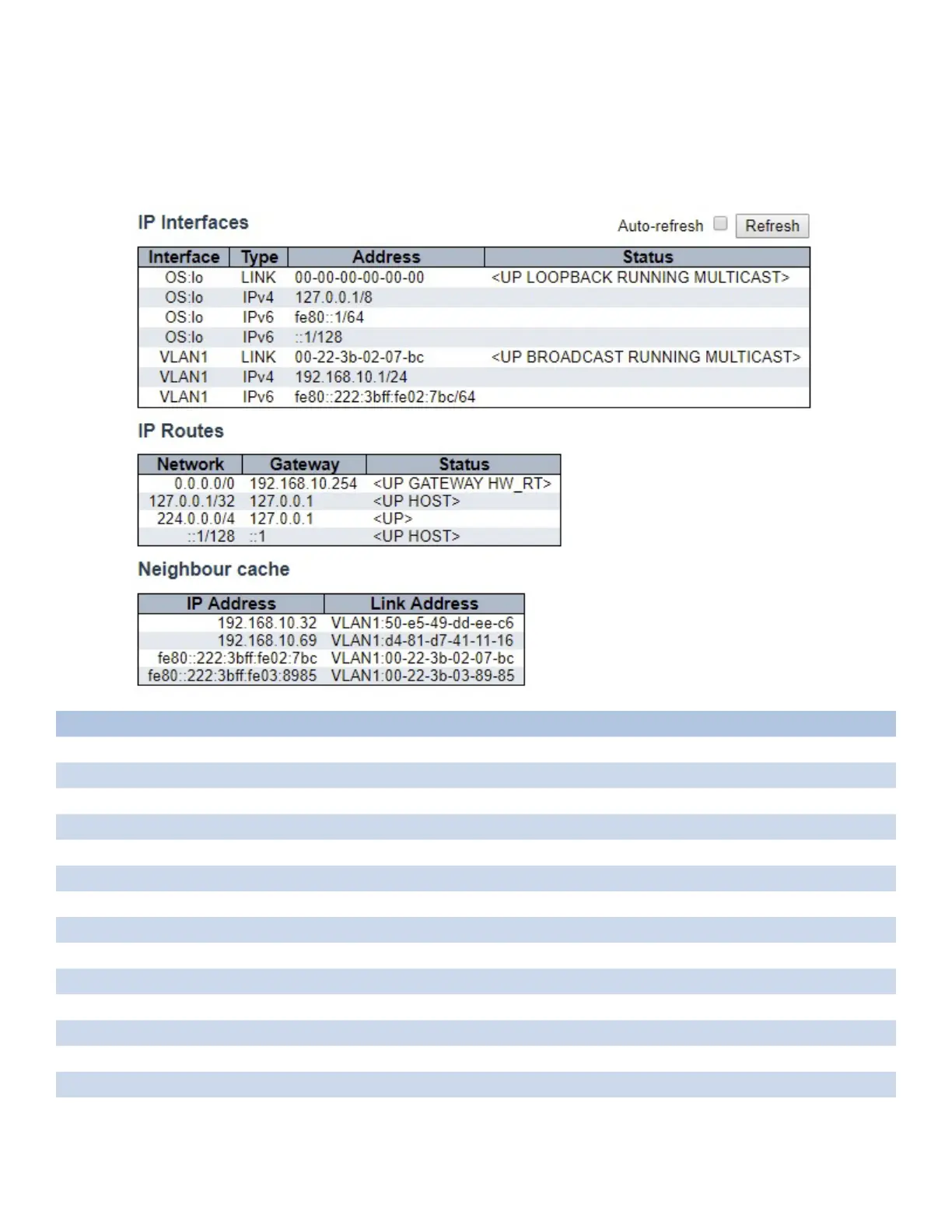 This page displays the status of the IP protocol layer. The status is defined by the IP interfaces, the