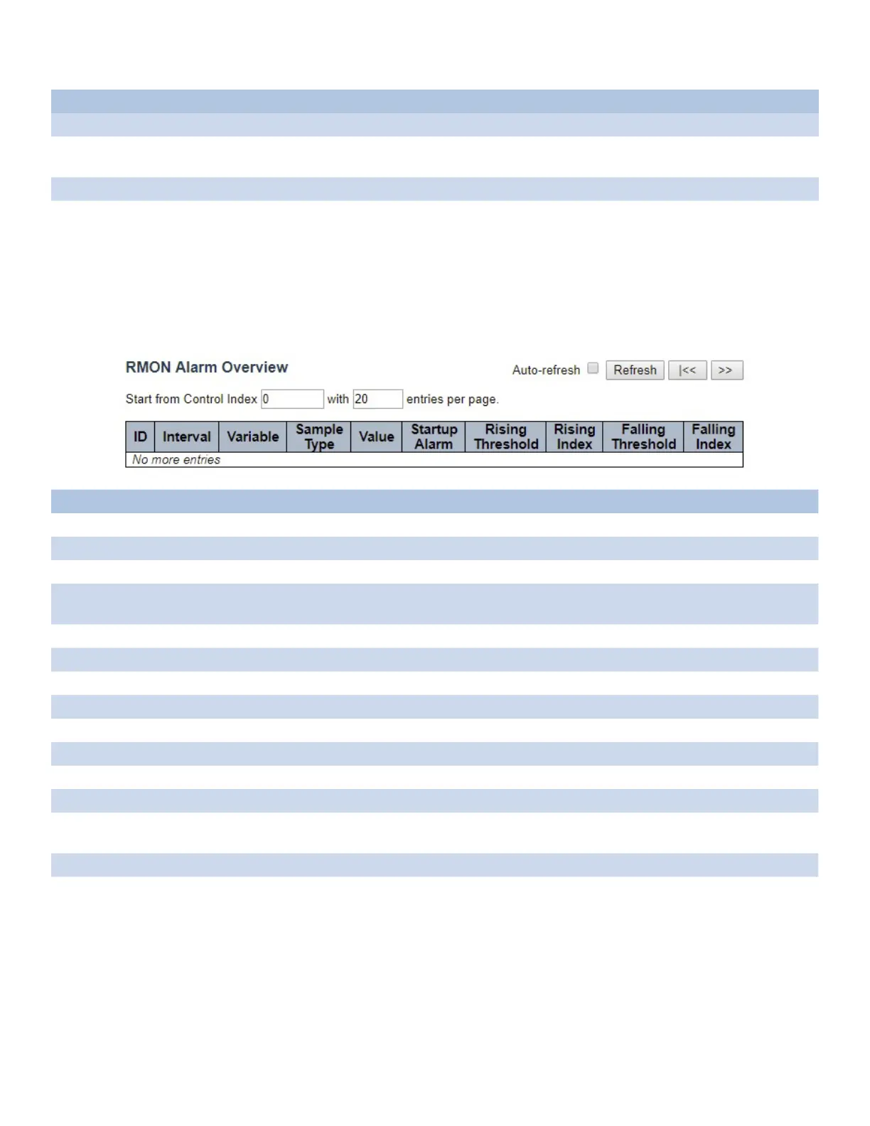 This page provides an overview of RMON Alarm entries. Each page shows up to 99 entries from