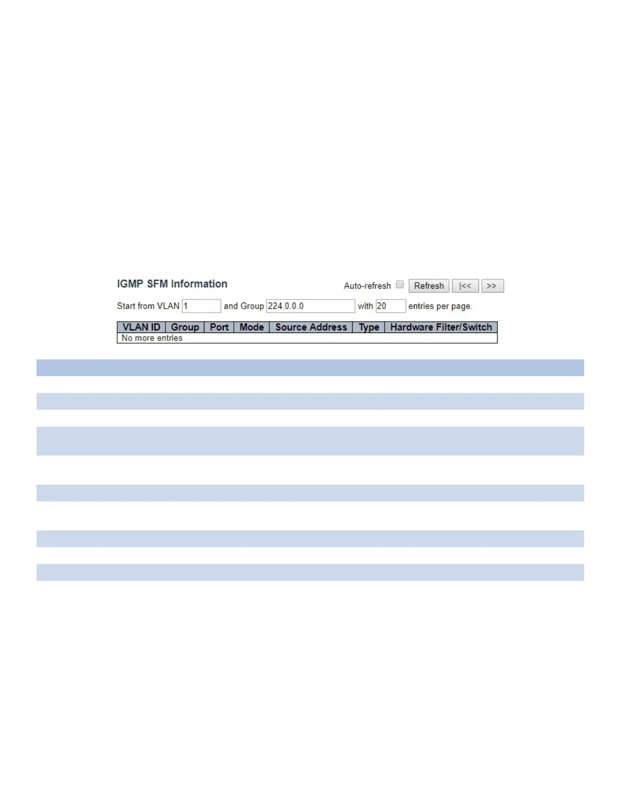 |<< Click to update the table starting from the first entry in the IGMP SFM Information Table.