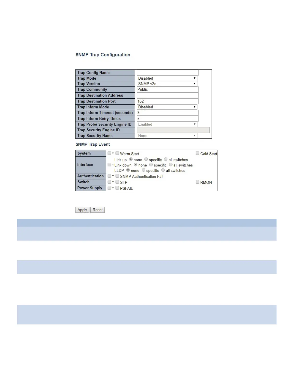 Trap Community Indicates the community access string when sending SNMP trap packet. The allowed string length