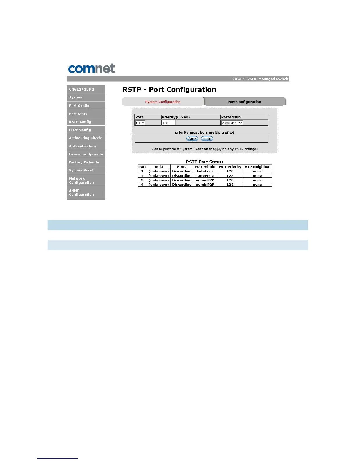 Important Note: A system reset must be performed after making changes to the RSTP settings.