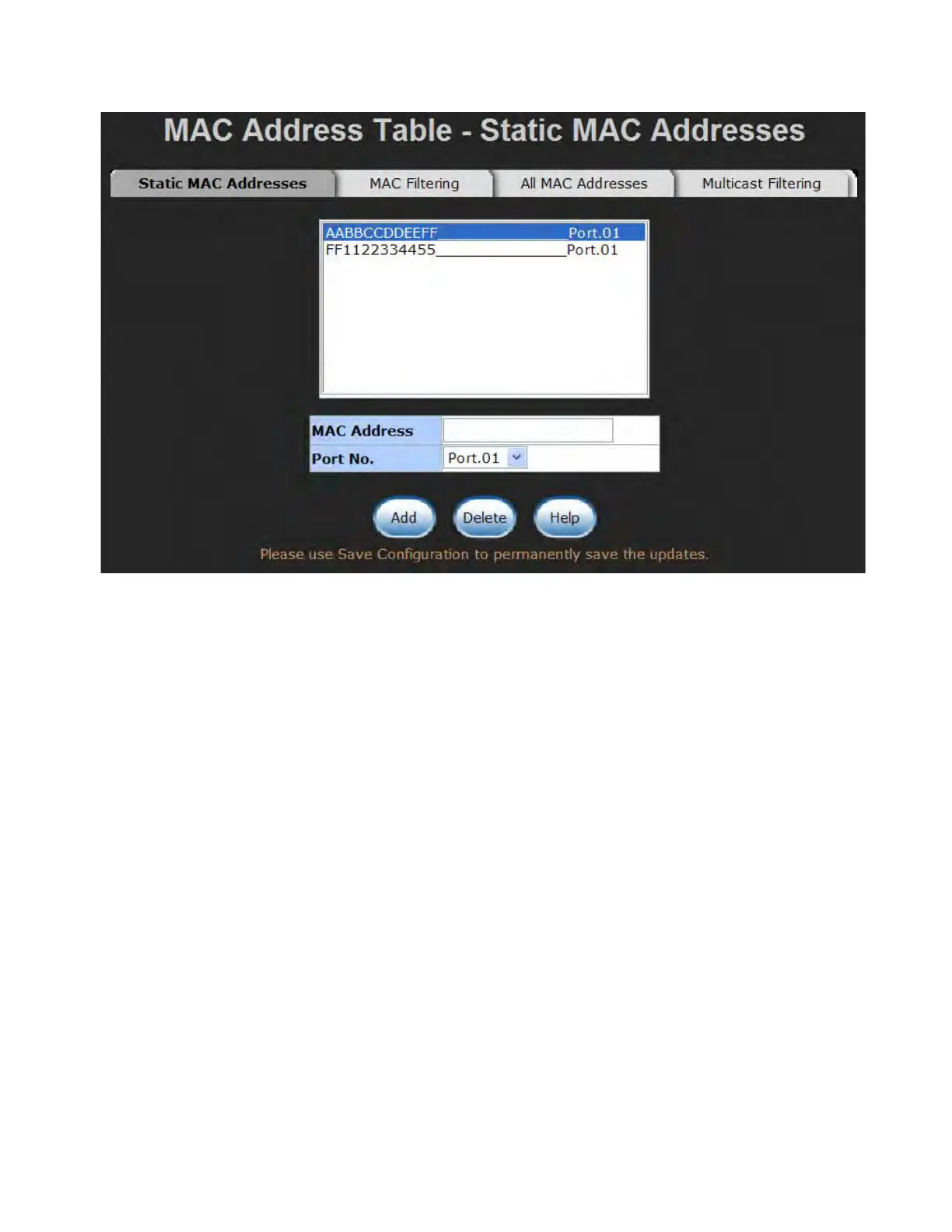 Static MAC Addresses interface