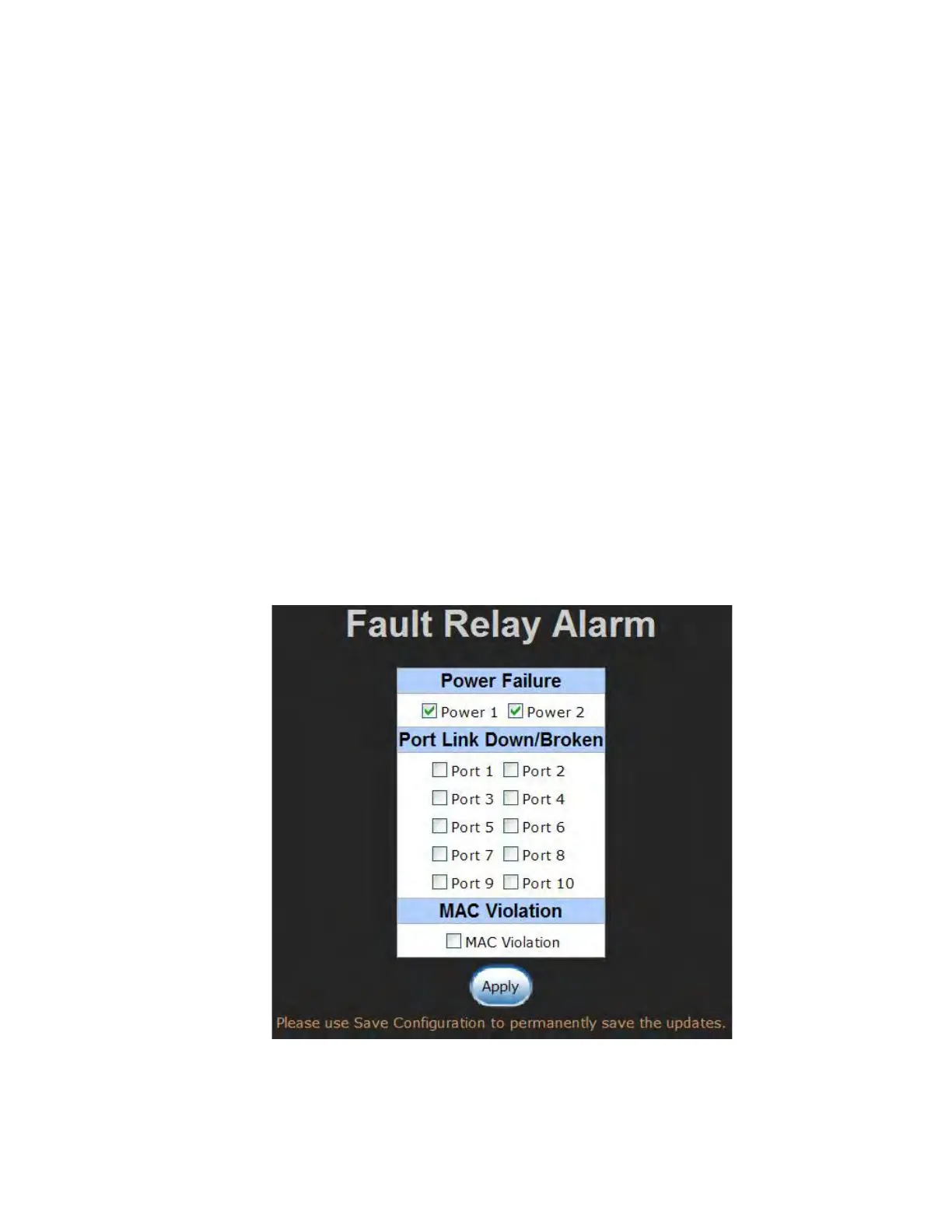 The Fault Relay Alarm function provides the Power Failure and Port Link Down/Broken