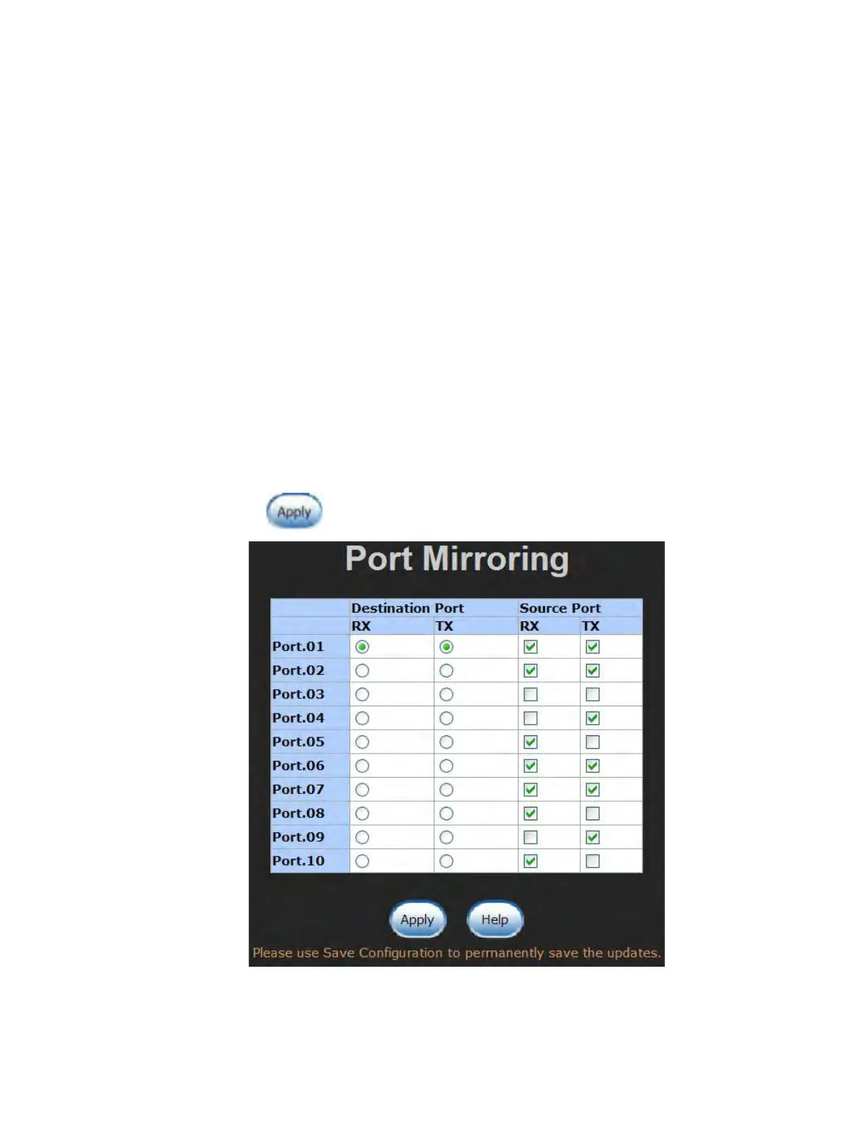 copied to mirror (destination) port. User can select multiple source ports by checking