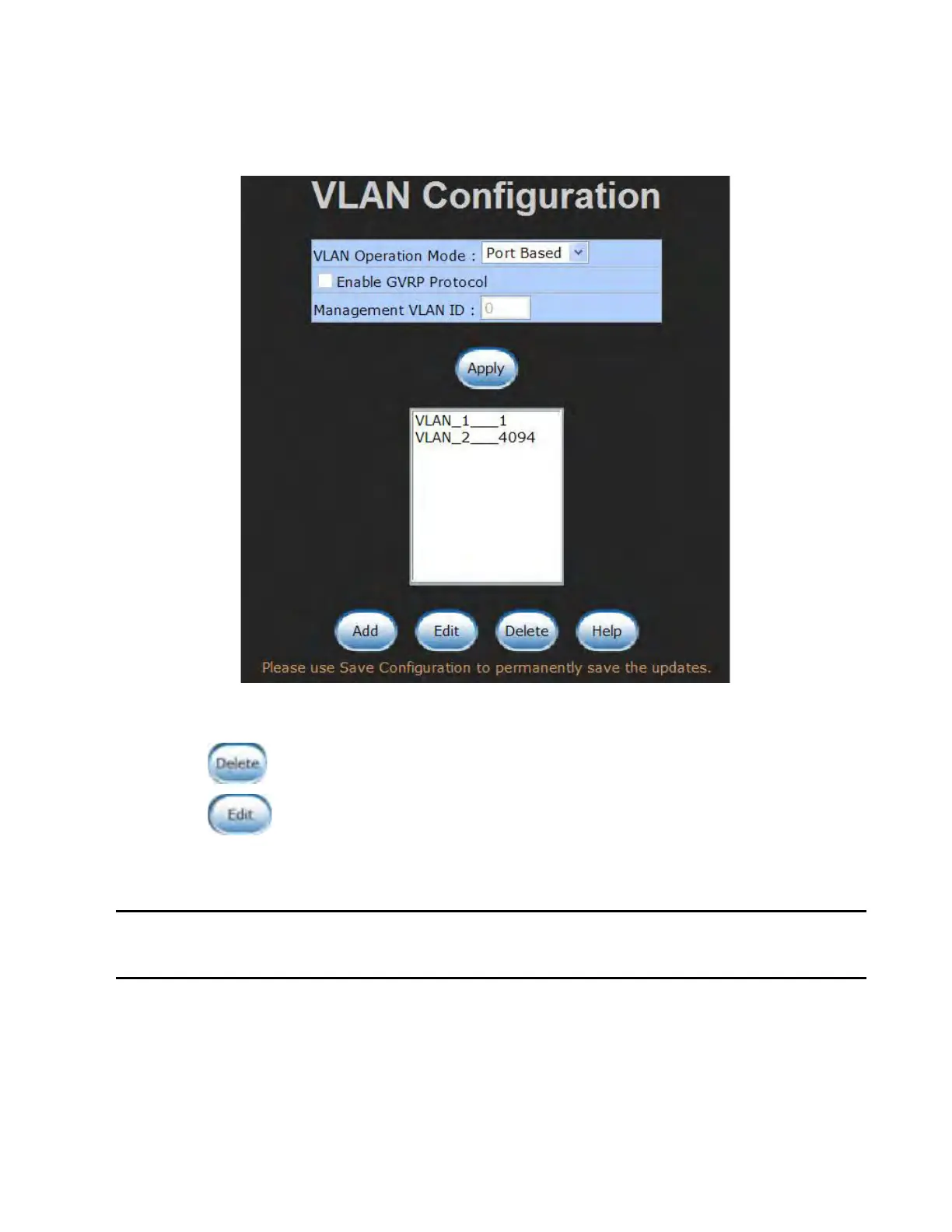 Use to modify group name, VLAN ID, or add/remove the members of the