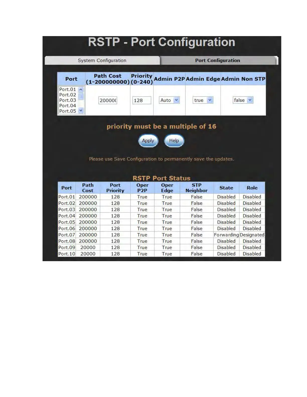 RSTP Port Configuration interface