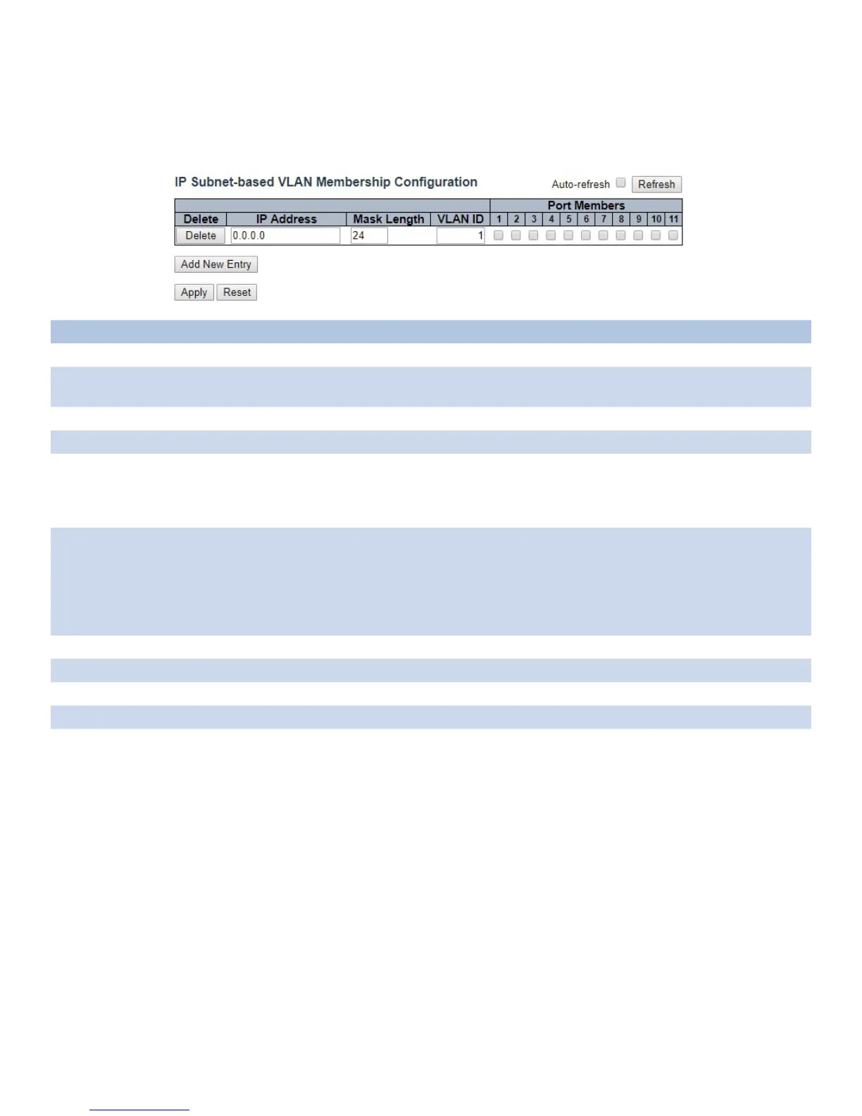 Port Members A row of check boxes for each port is displayed for each IP subnet to VLAN ID mapping entry.