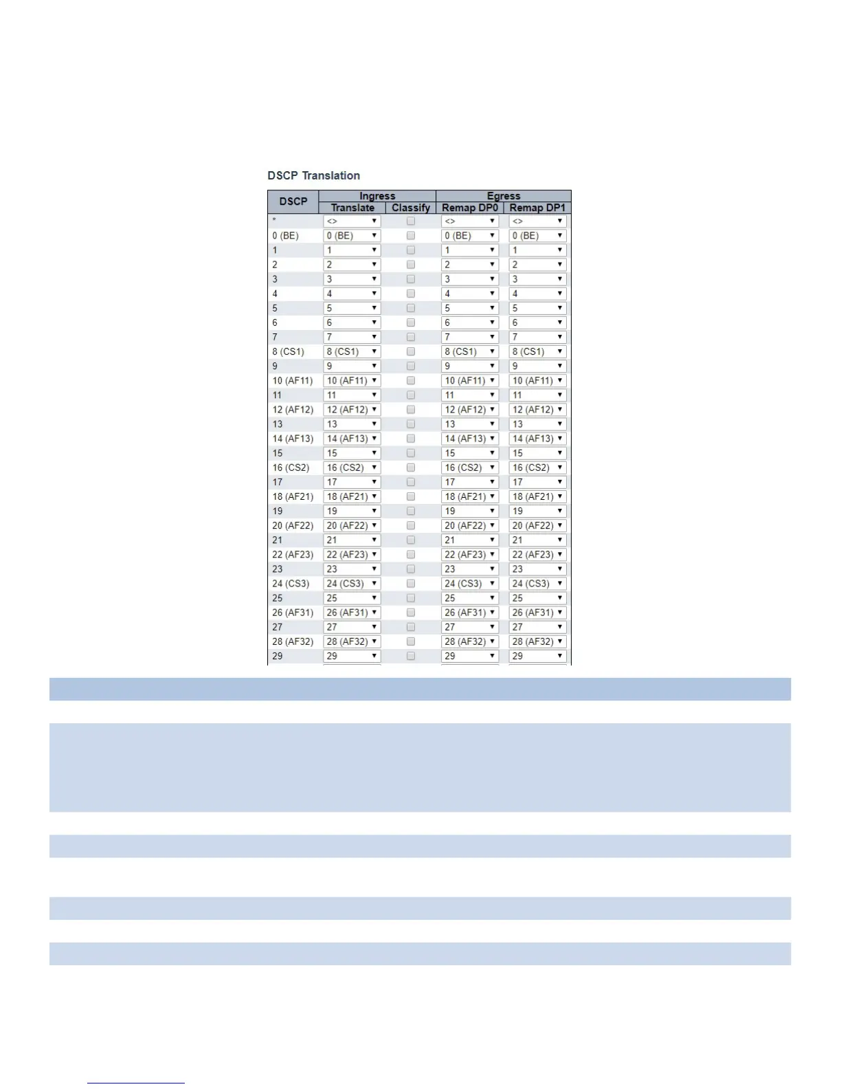 This page allows you to configure the basic QoS DSCP Translation settings for all switches. DSCP