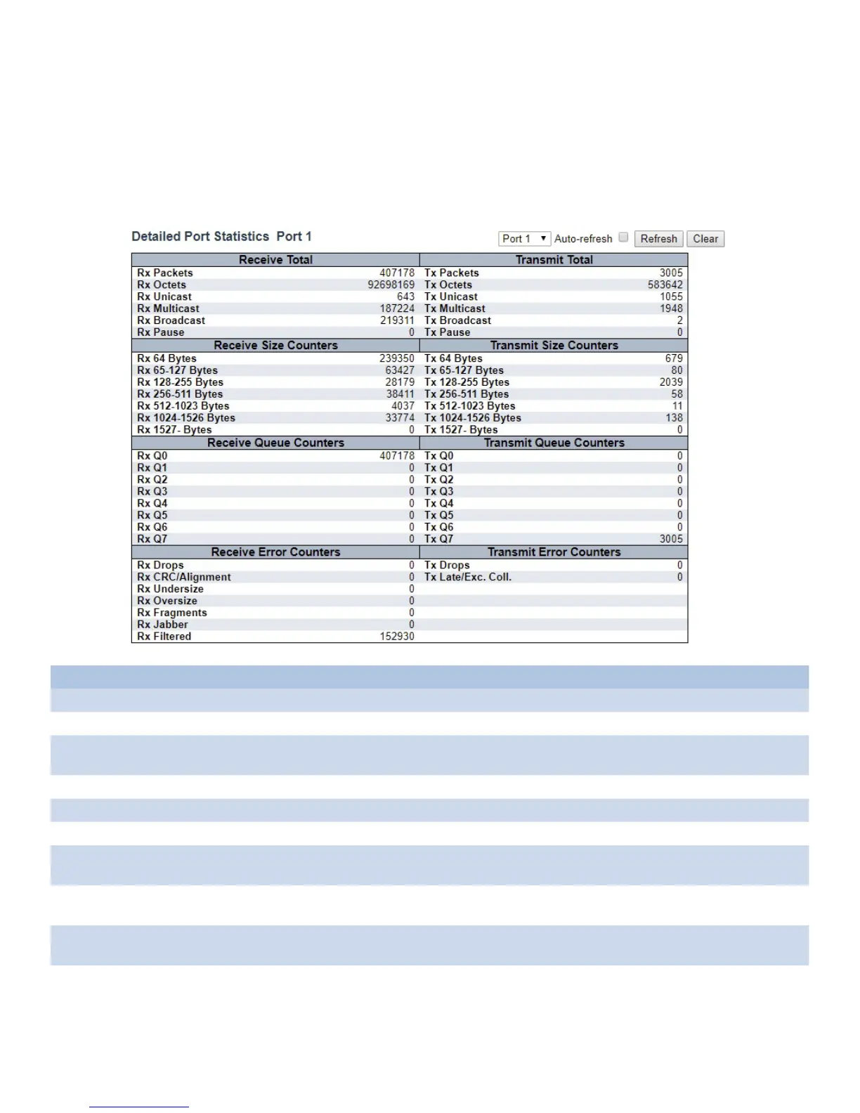 This page provides detailed traffic statistics for a specific switch port. Use the port select box to
