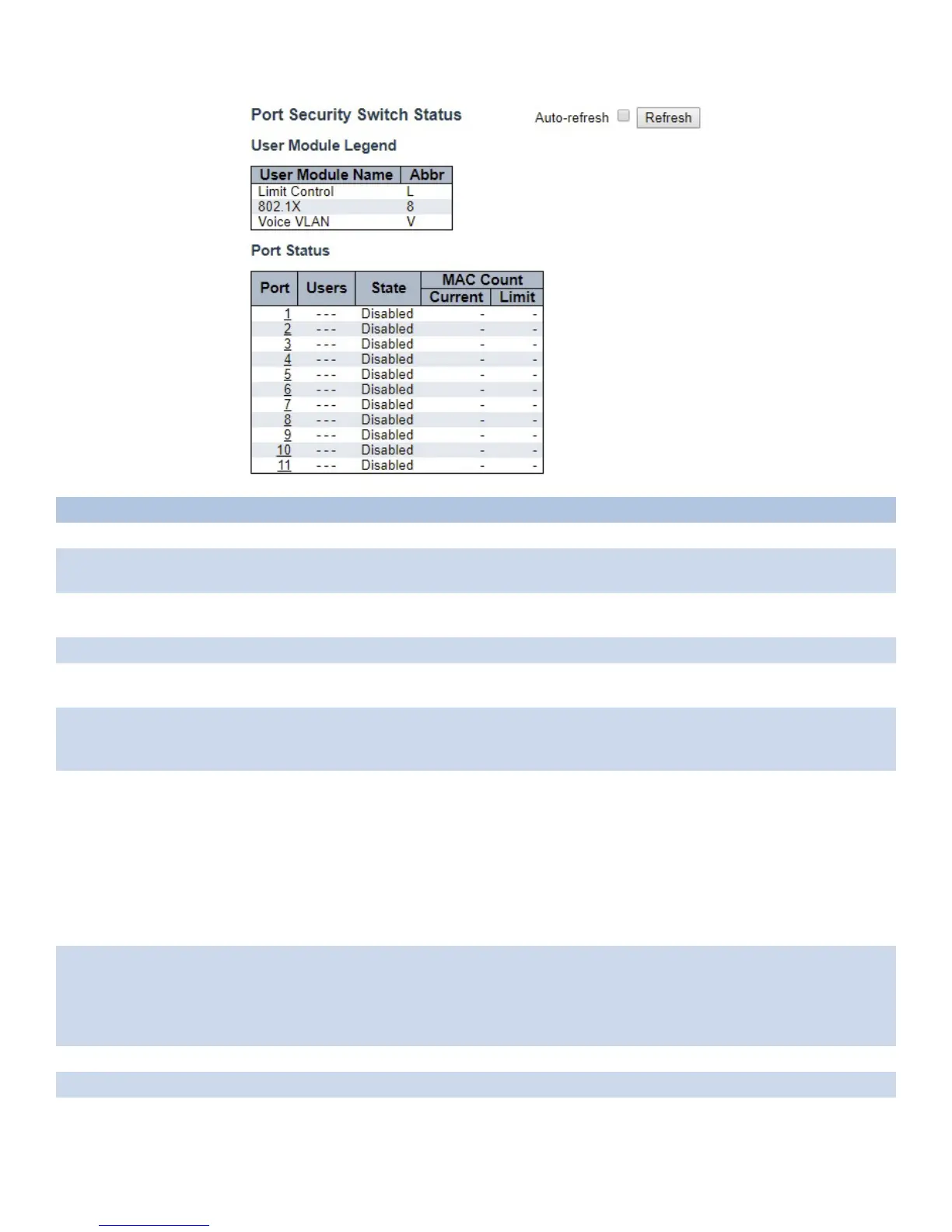 If the Limit Control user module is not enabled on the port, the Limit column will show a dash (-).