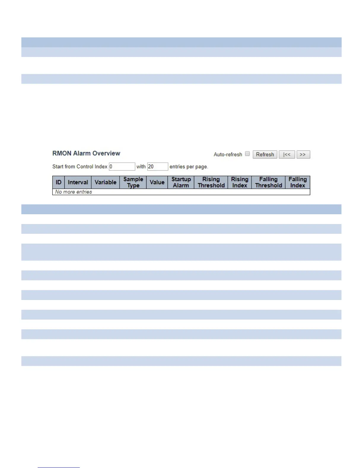 This page provides an overview of RMON Alarm entries. Each page shows up to 99 entries from