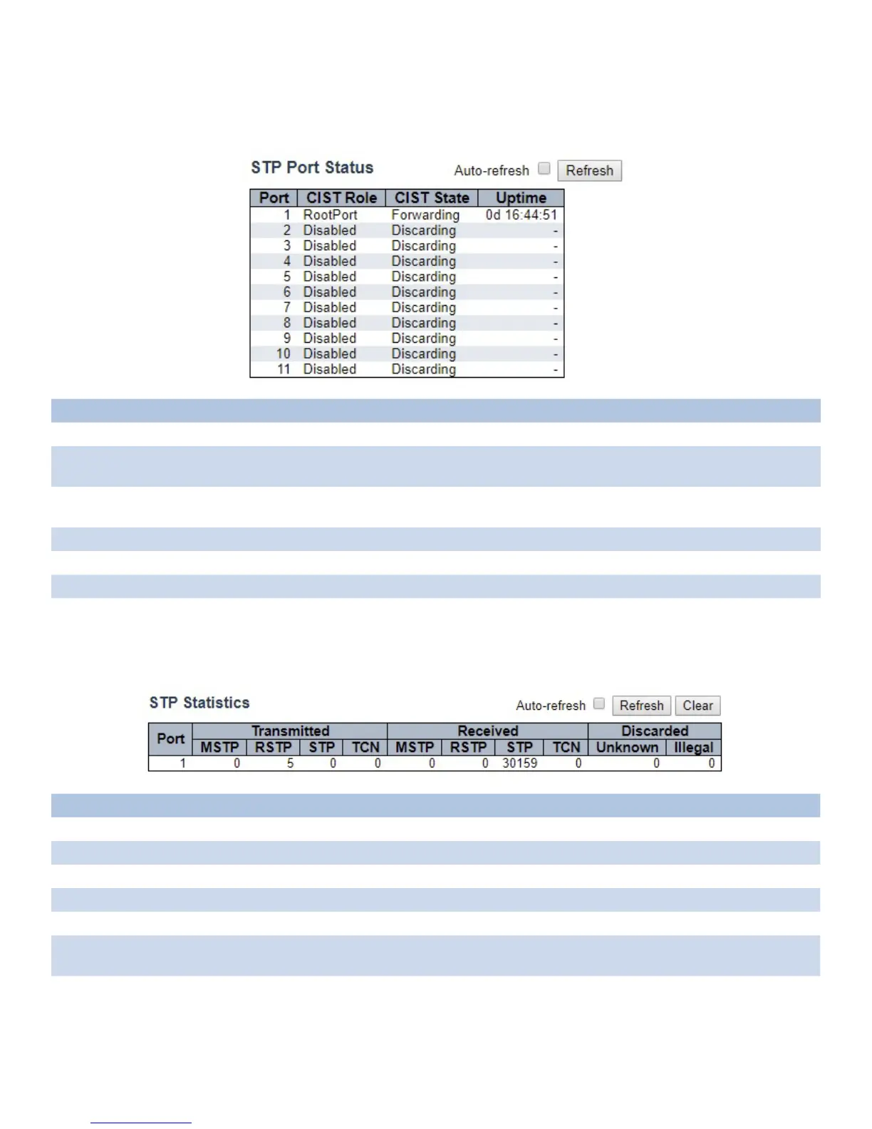 This page displays the STP port statistics counters of bridge ports in the switch.