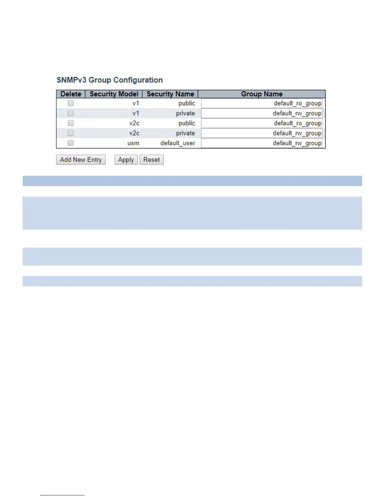 Configure SNMPv3 group table on this page. The entry index keys are Security Model and