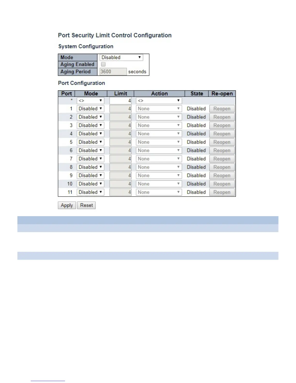 Mode Indicates if Limit Control is globally enabled or disabled on the switch. If globally disabled, other