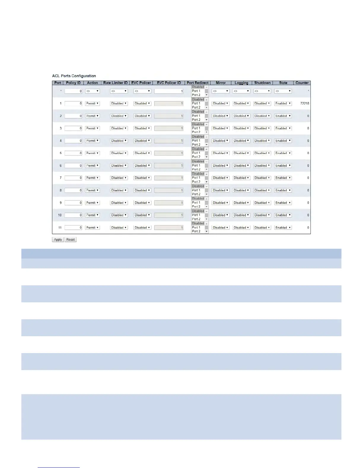 Configure the ACL parameters (ACE) of each switch port. These parameters will affect frames