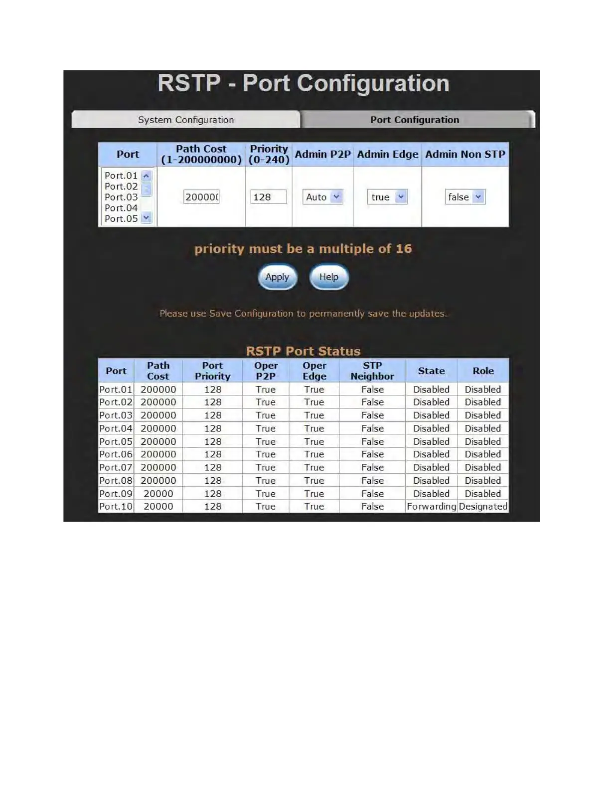 RSTP Port Configuration interface