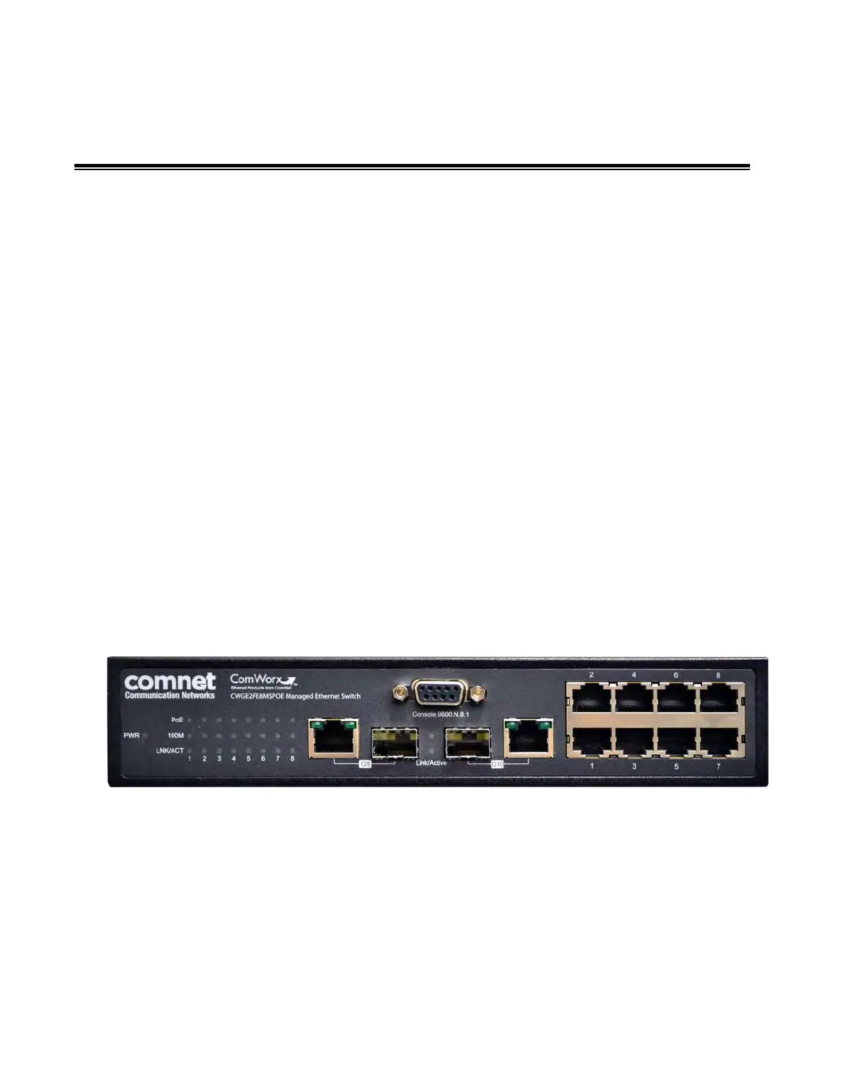 The front panel of the CWGE2FE8MSPOE Managed Switch consists of 8 x 10/100Base-TX