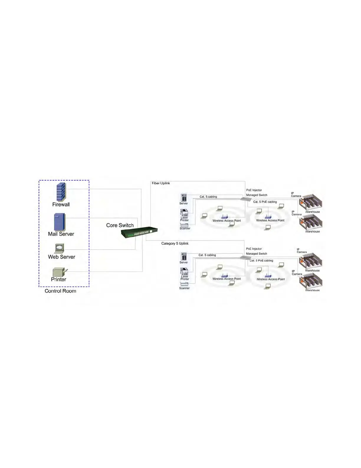 In the illustration below, two managed PoE switches with PCs, print server, local server,