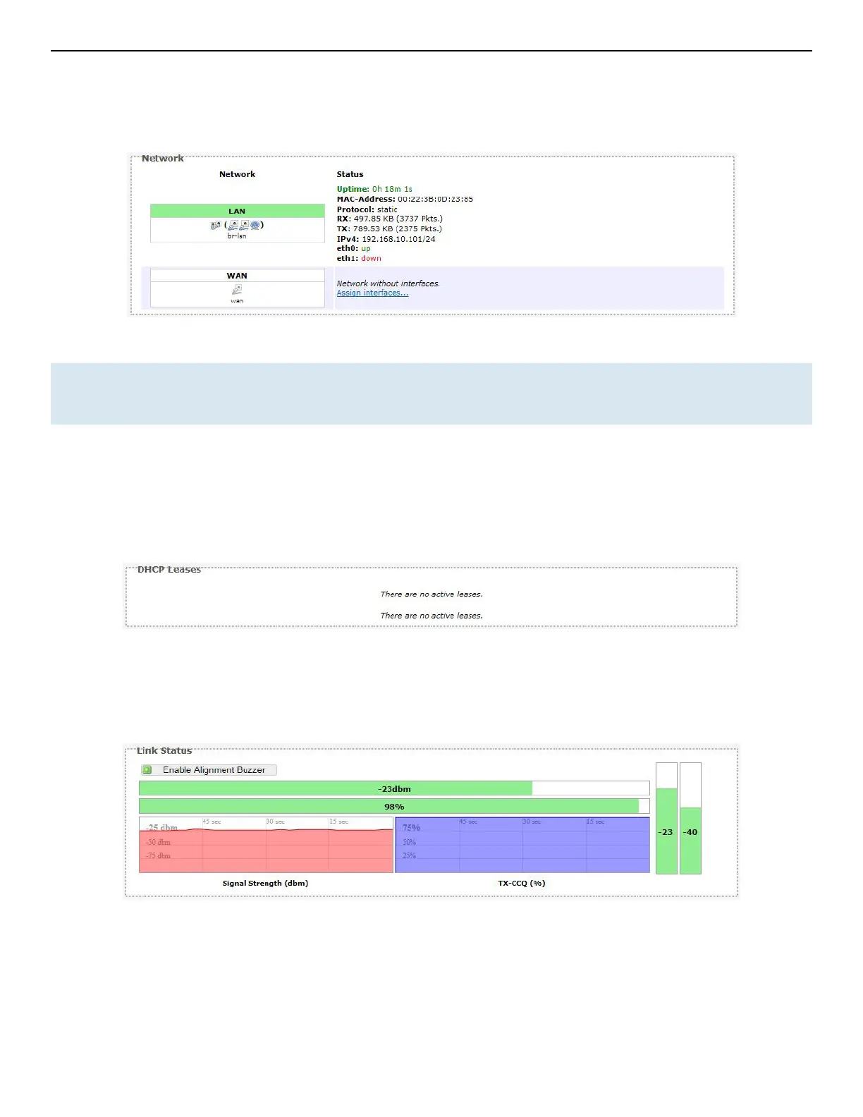 Status Shows summaries of the interfaces for the LAN and WAN zones. This may include uptime, MAC