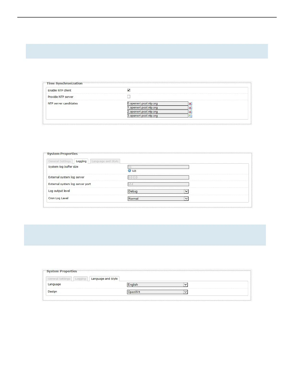 system log server, External system log server port, Log output level, and Cron Log