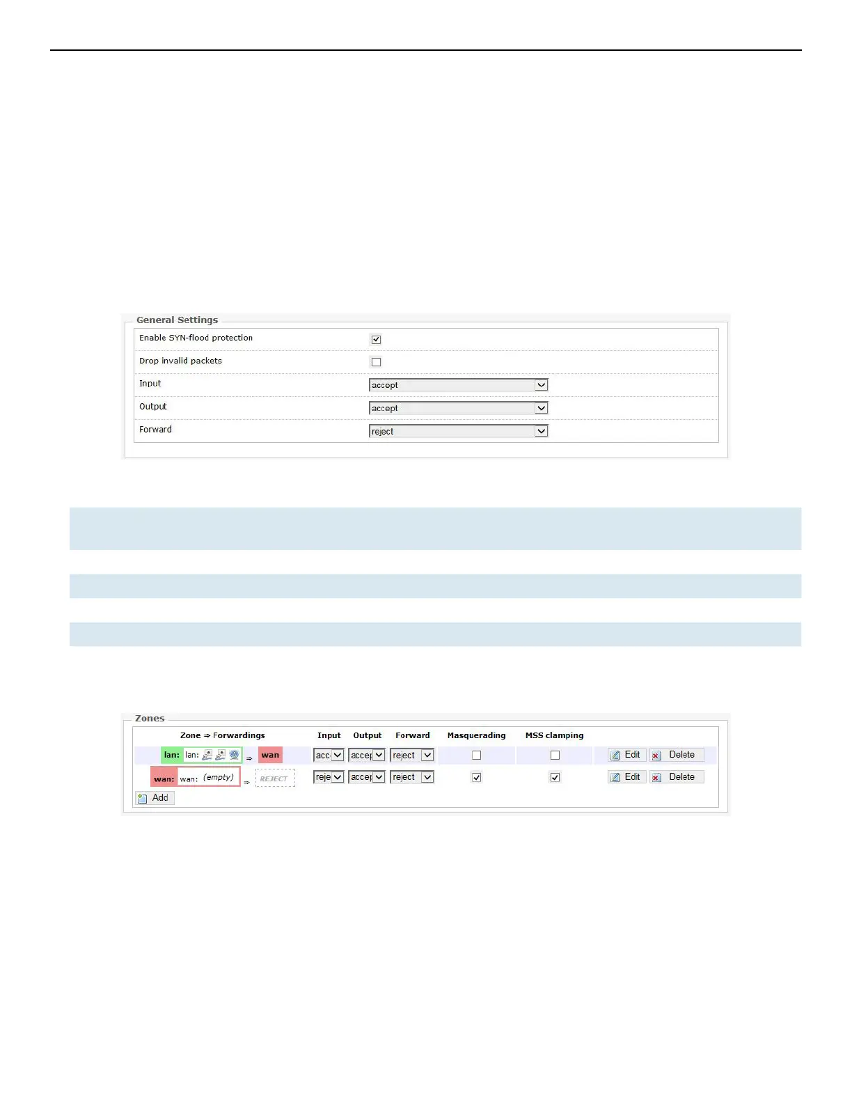 Figure 50: The Zones section showing the default settings for the firewall zones.