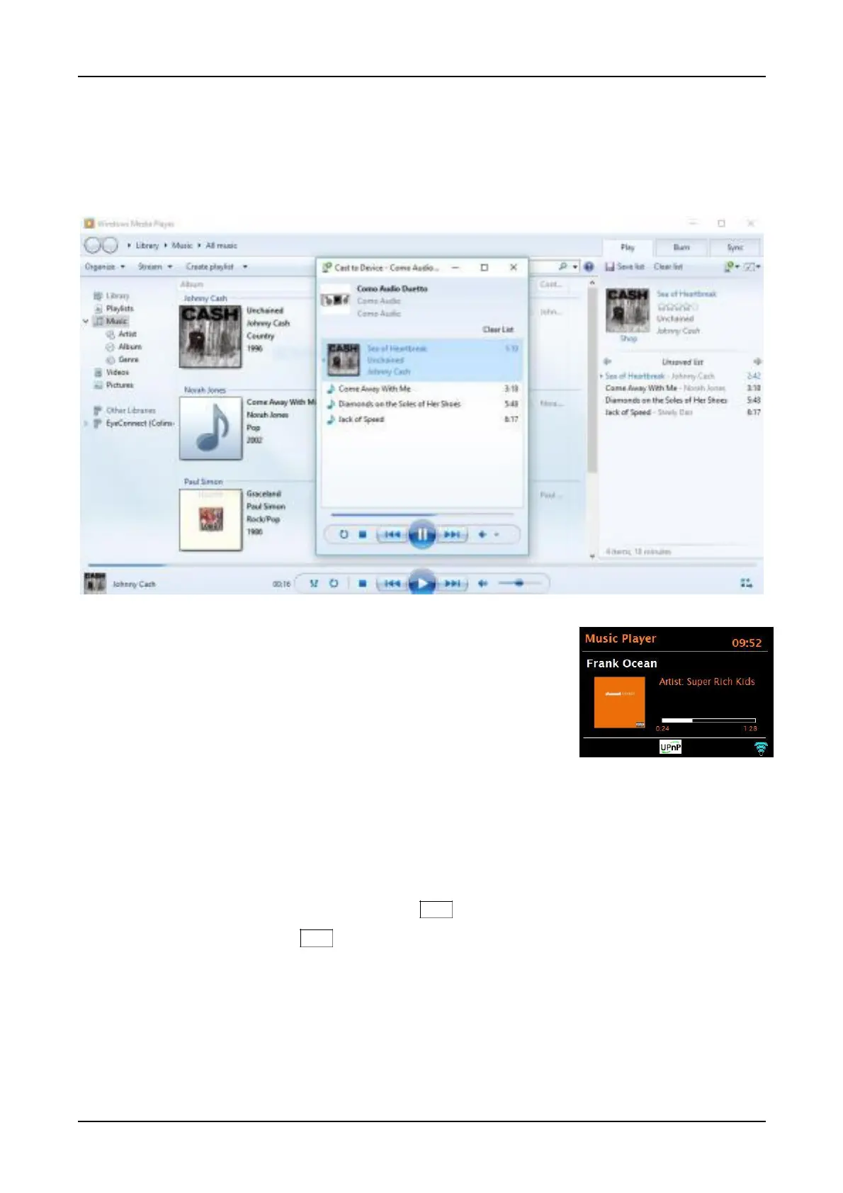 figures for elapsed and total track time. At the bottom of the screen, an icon indicates UPnP. To