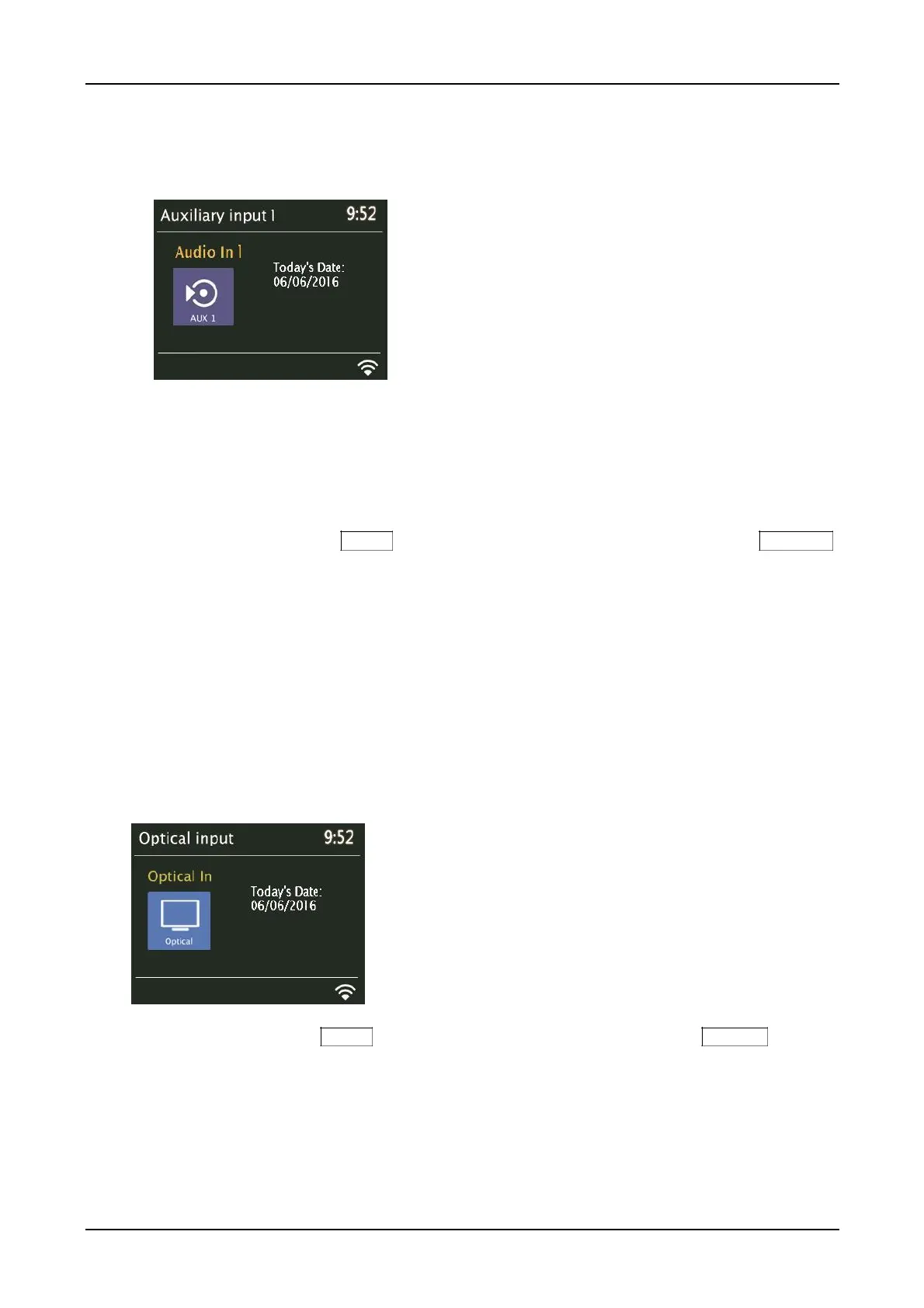 Aux in mode plays audio from an external source such as an MP3 or CD player via an audio cable.