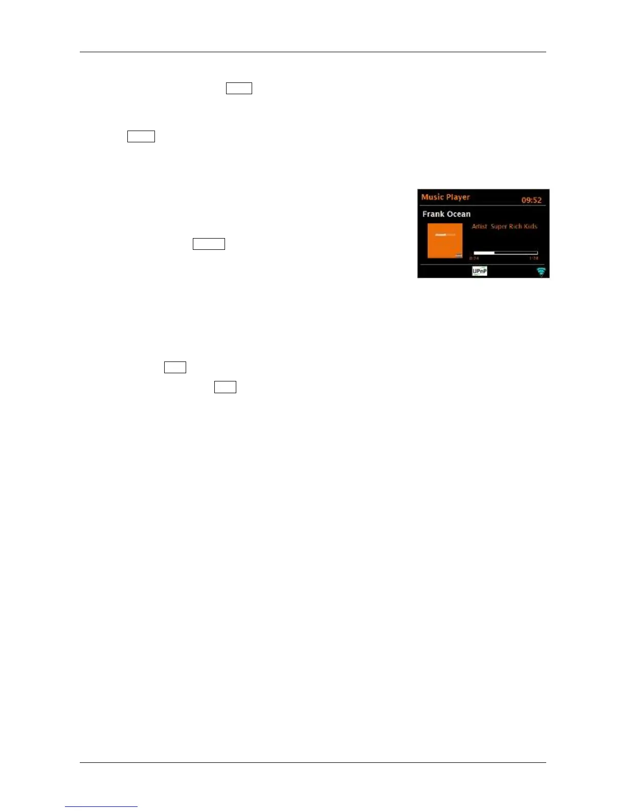 While a track is playing, the screen shows its track and artist (UPnP) or file name (USB). There is