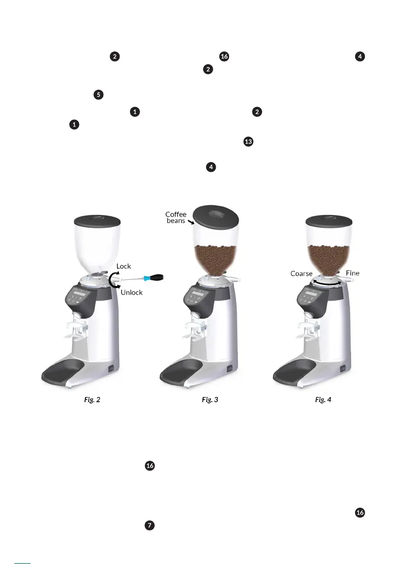 Place the hopper ( ) on the grind regulator ( ) and make sure the bean trap ( )