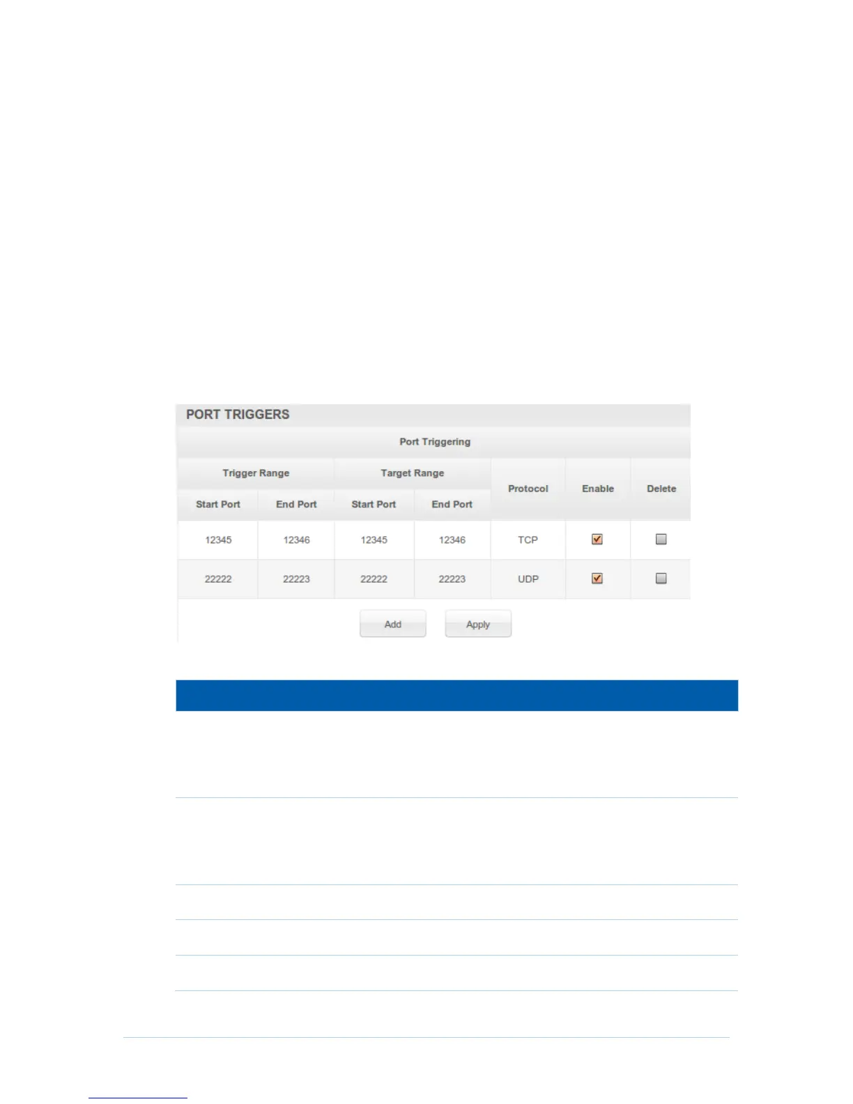 The Advanced Port Triggers are similar to Advanced Port Forwarding except that they