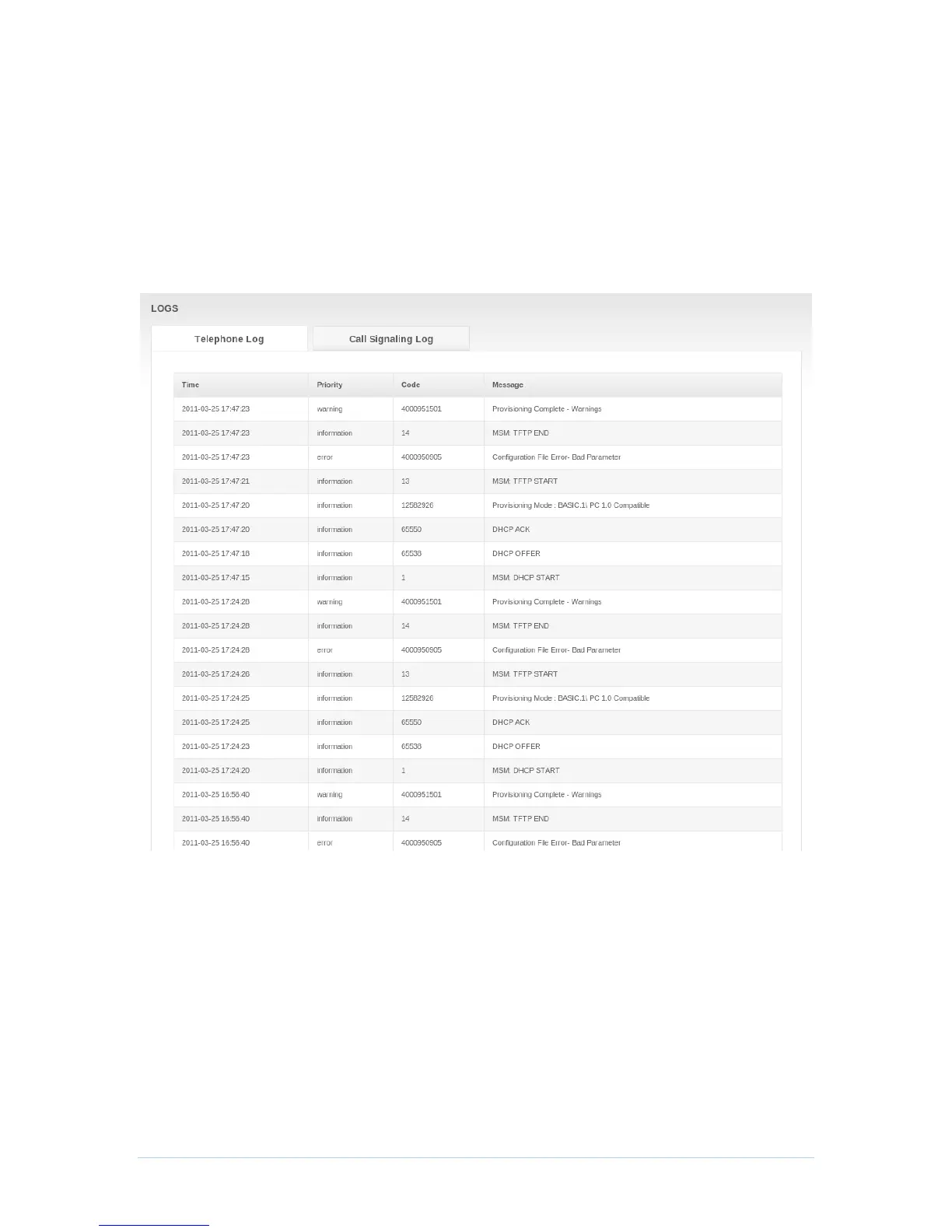 This tab displays the log of call signaling messages which are exchanged during MTA