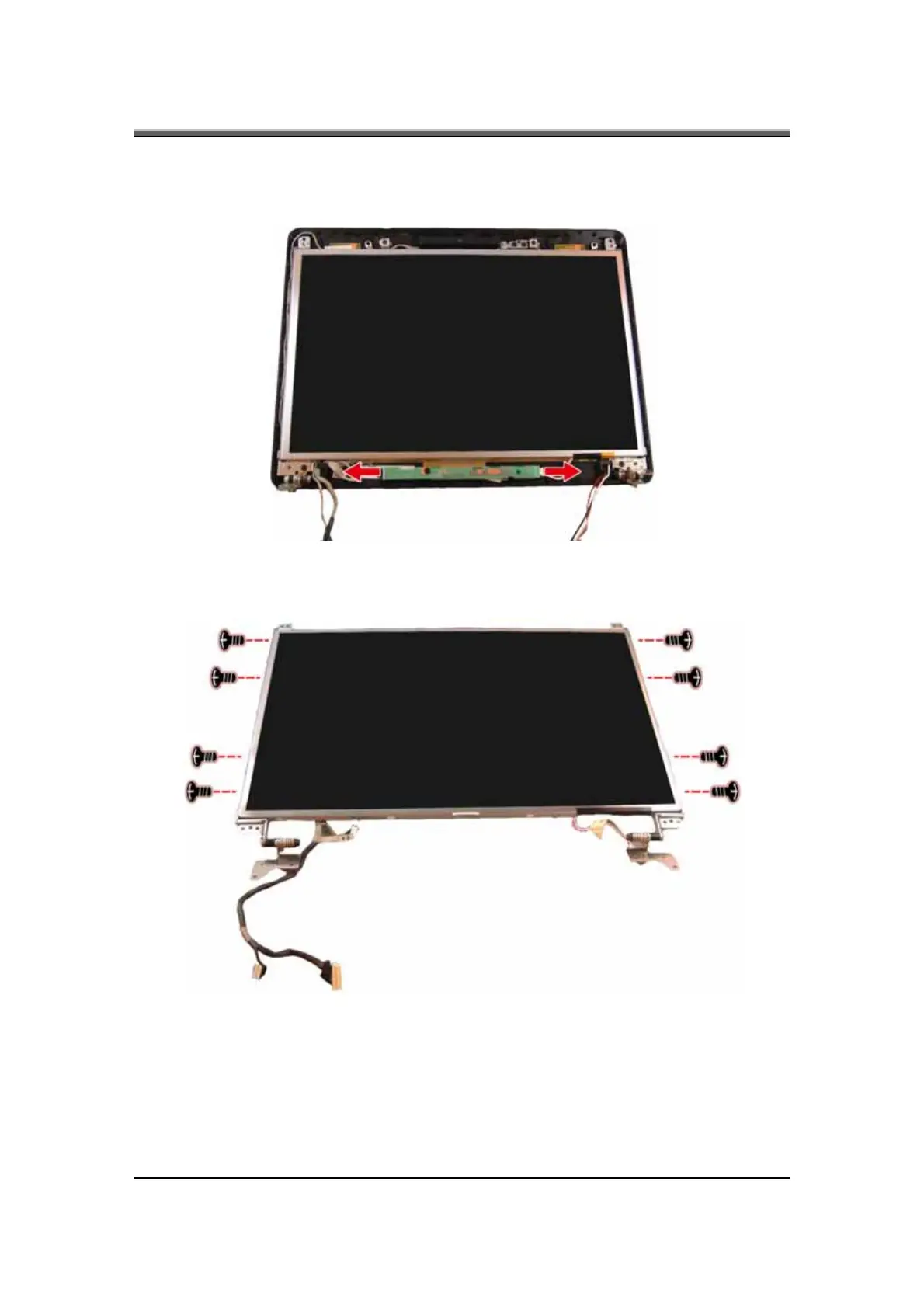 6. Gently lift out the display. Remove eight screws securing the hinges to the