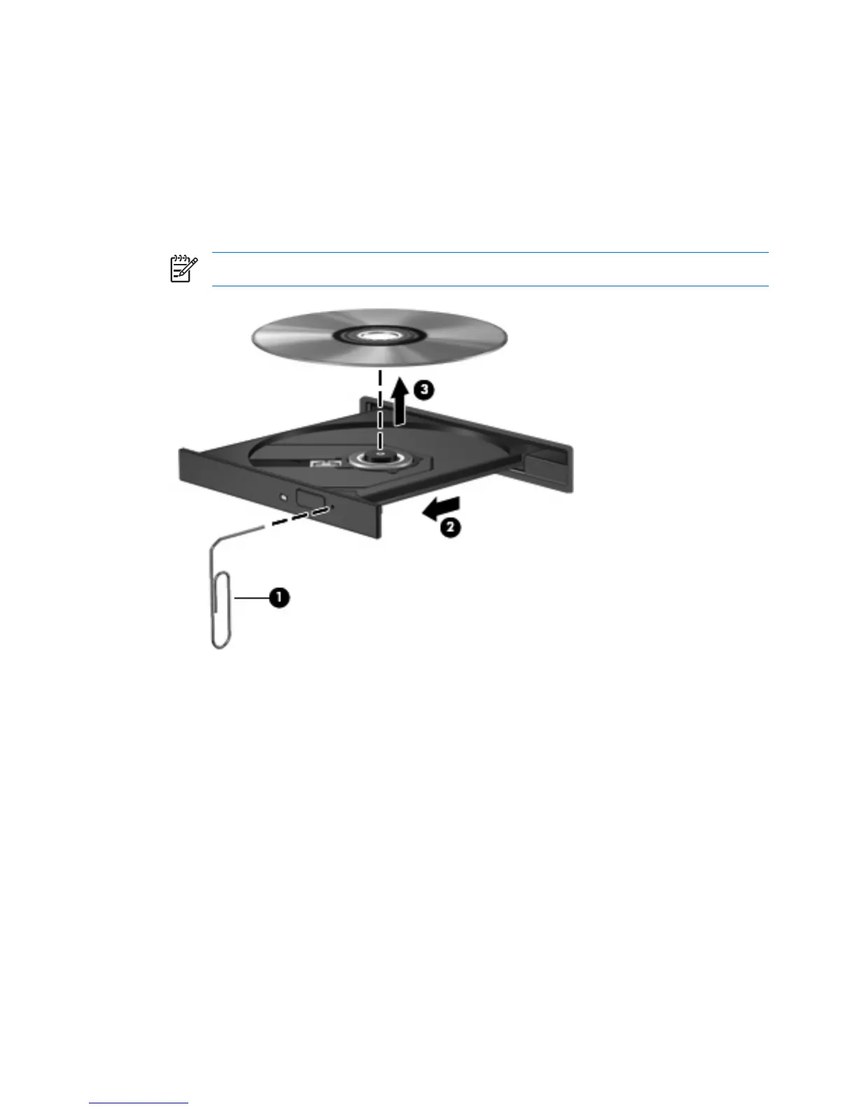 1. Insert the end of a paper clip (1) into the release access in the front bezel of the drive.