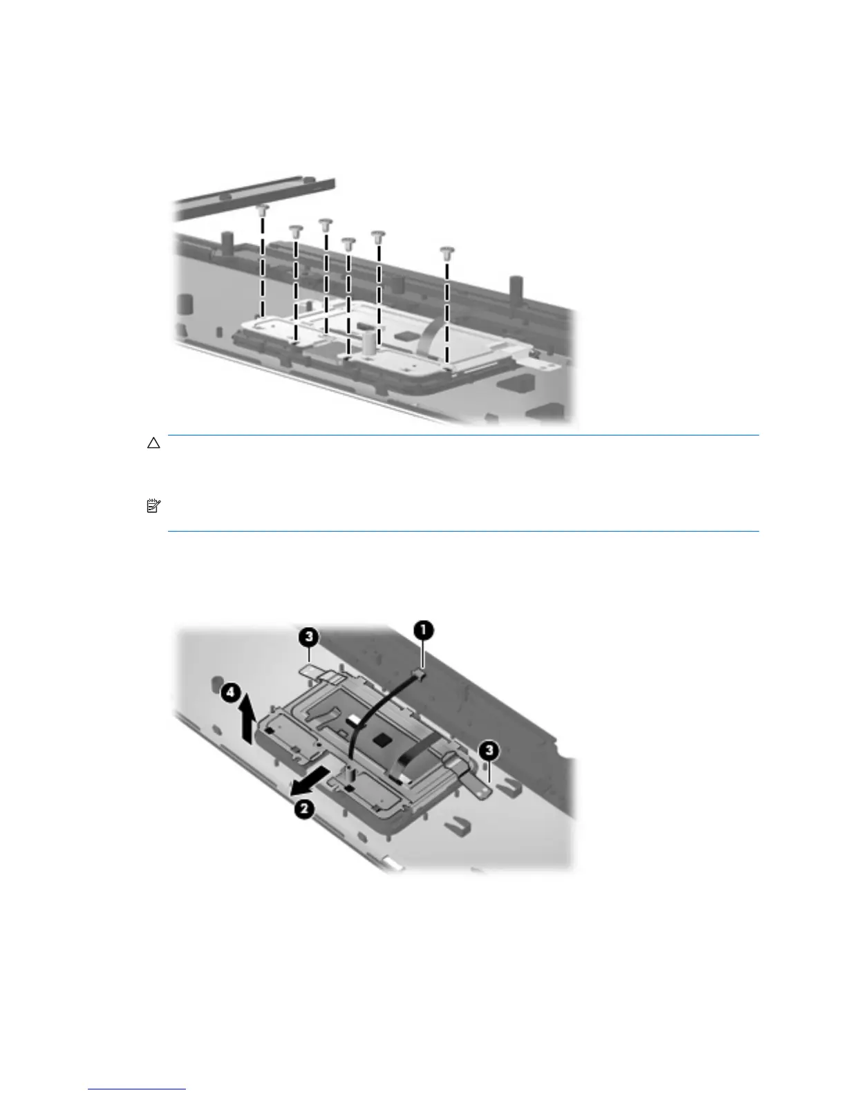 (1) is removed through the opening in the TouchPad bracket. Failure to follow this caution may