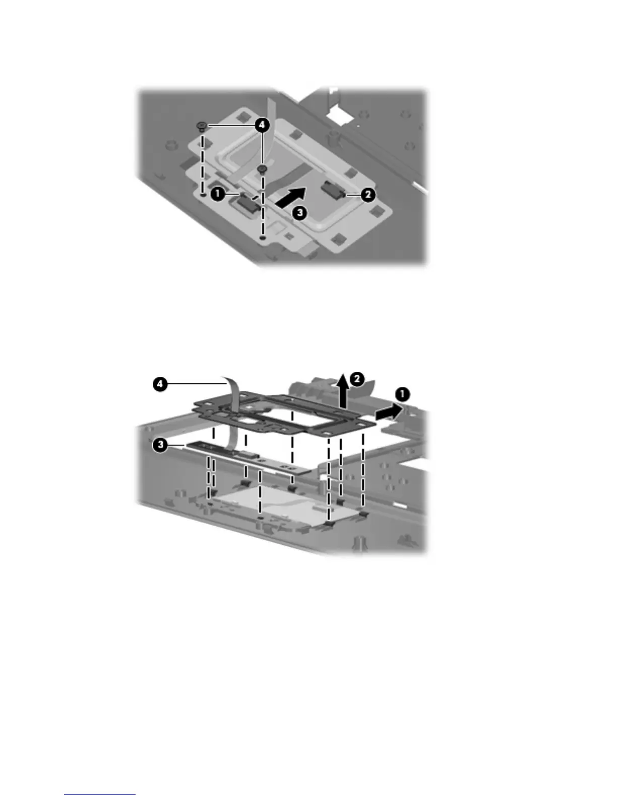 8. Remove the TouchPad button board cable (4) from the opening in the TouchPad bracket.