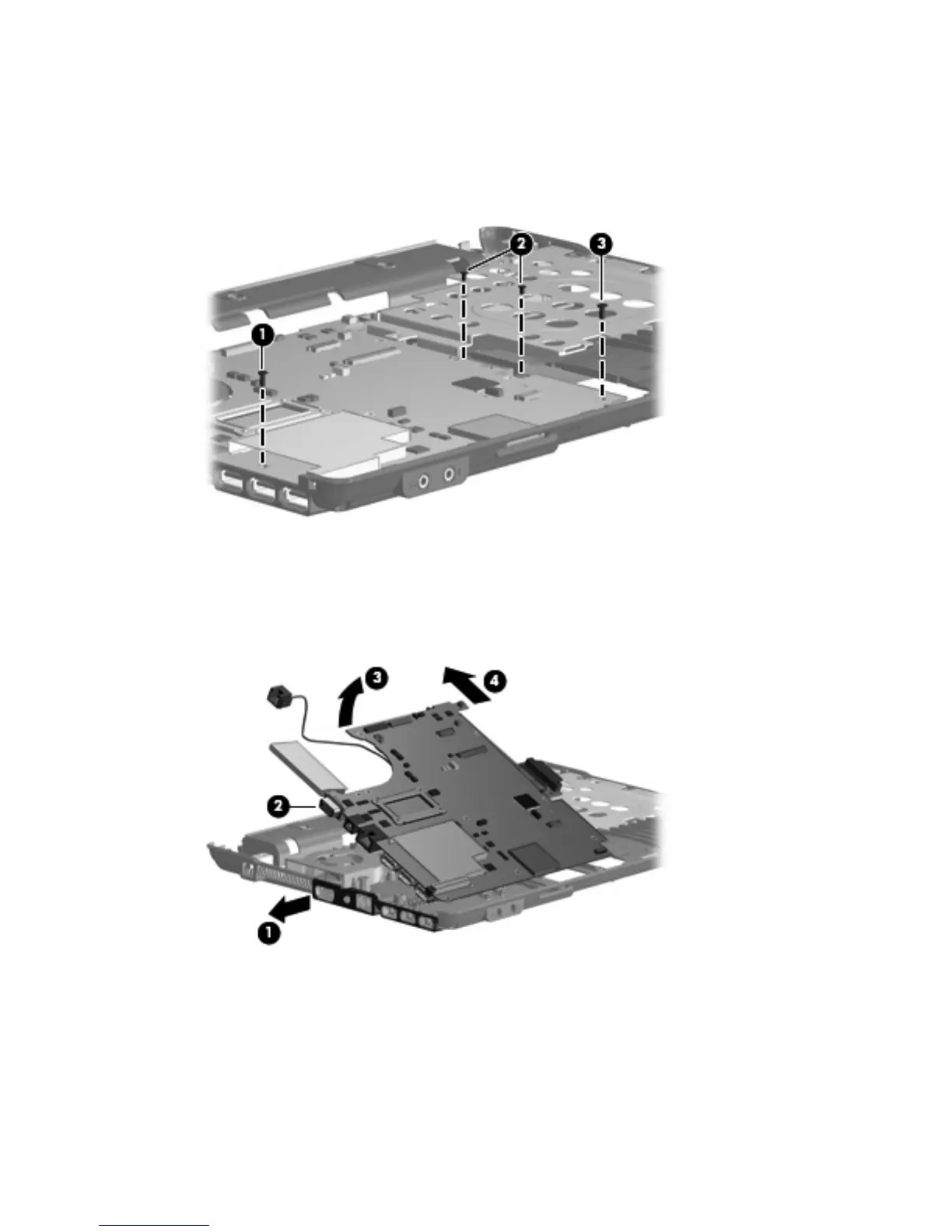6. Remove the system board (4) from the base enclosure by sliding it back.