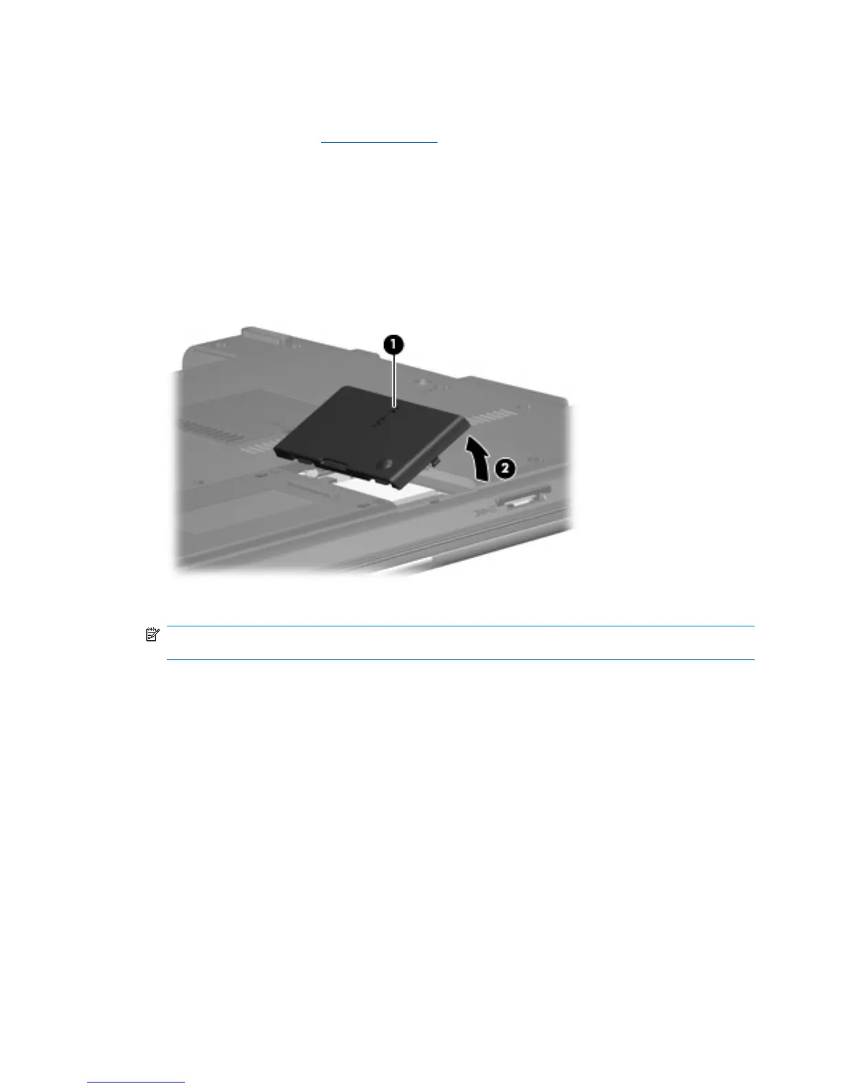 3. Lift the right side of the WLAN module compartment cover (2), swing it to left, and remove the