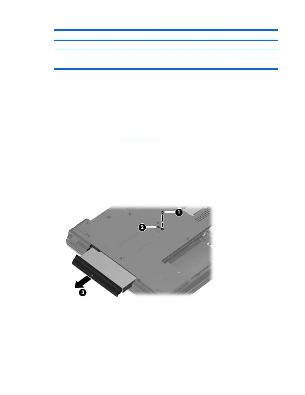 3. Insert a flat-bladed screwdriver or similar tool into the optical drive tab access (2) and press the