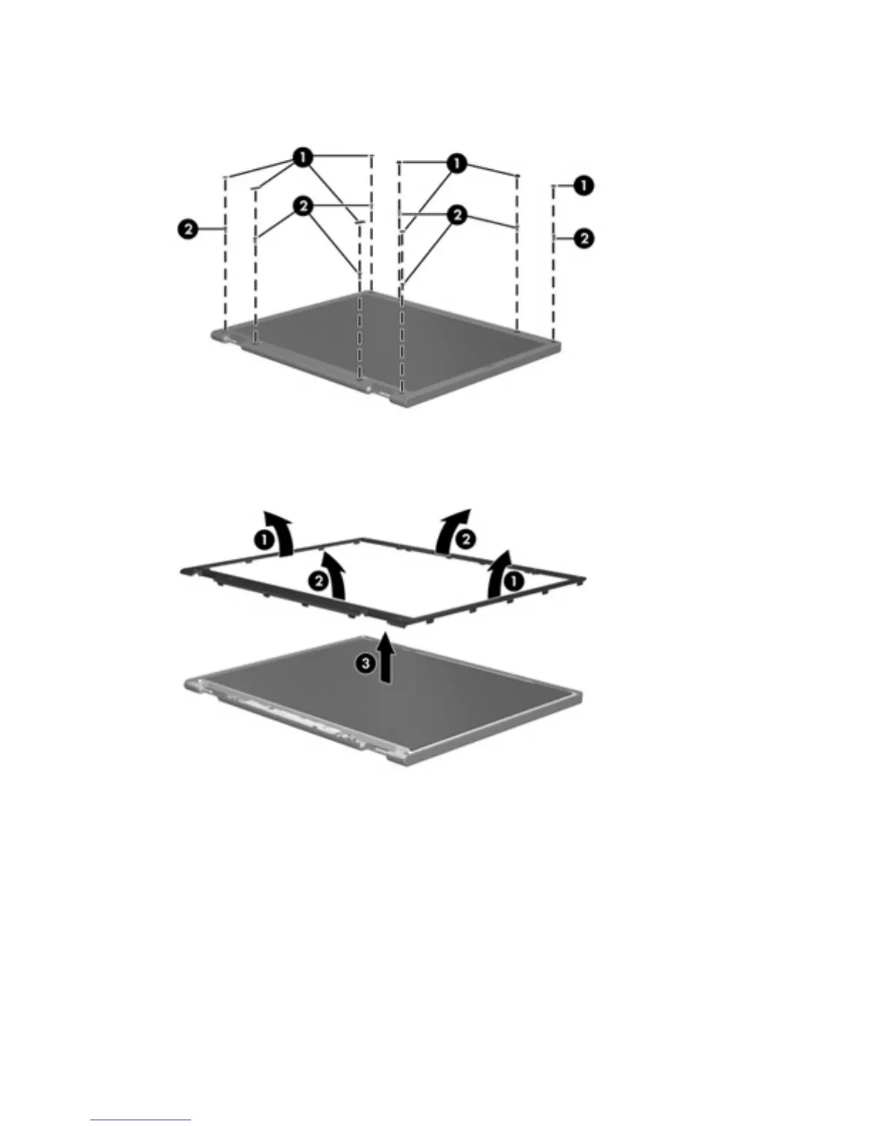 1. Remove all screw covers (1) and screws (2) that secure the display bezel to the display assembly.