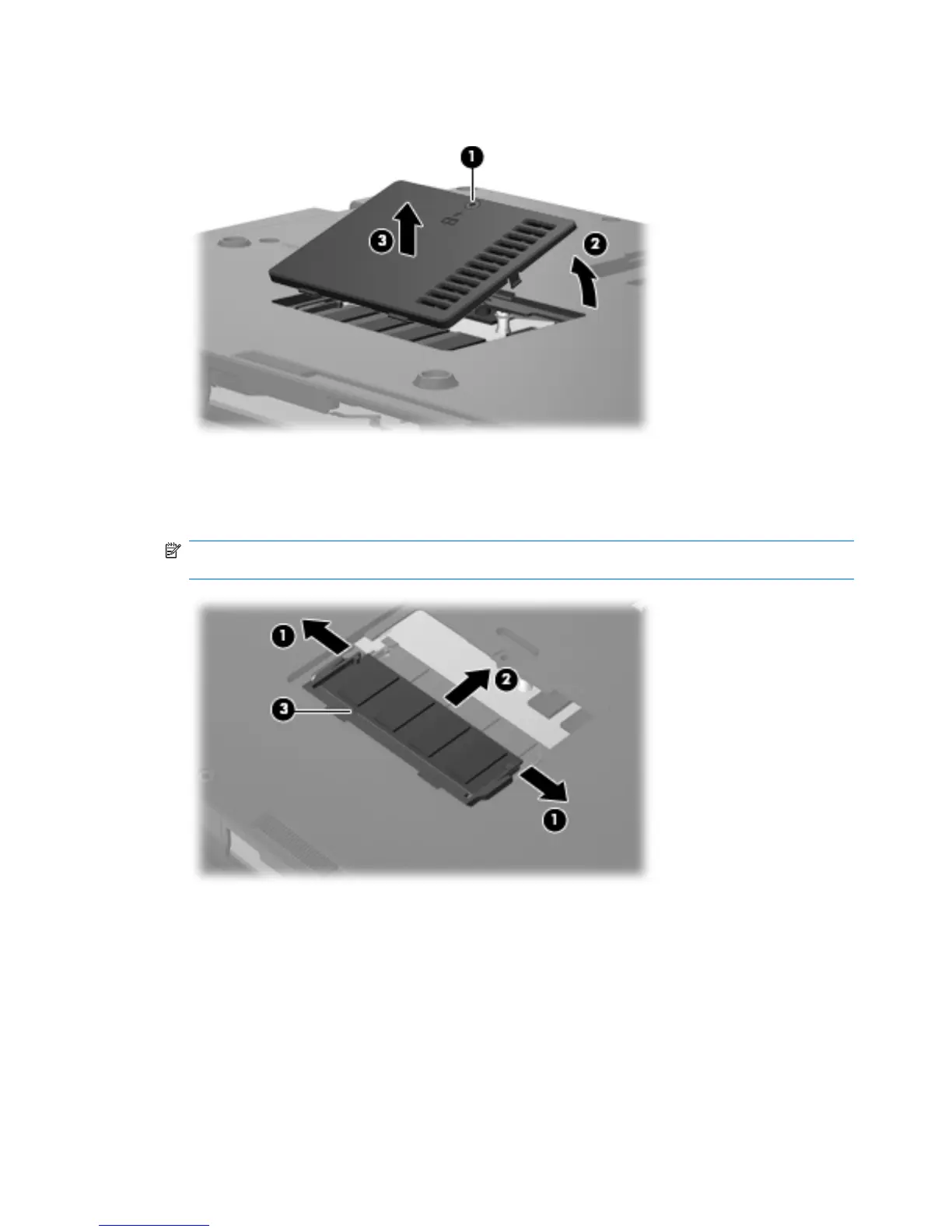 2. Lift the front edge of the cover (2), swing it up and back, and remove the cover (3). The memory